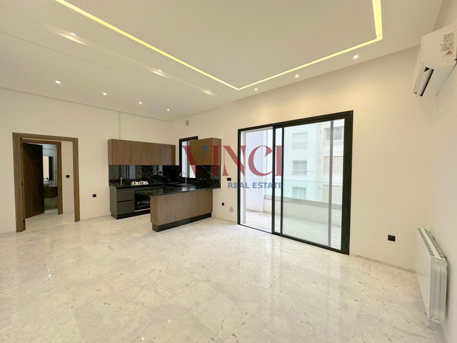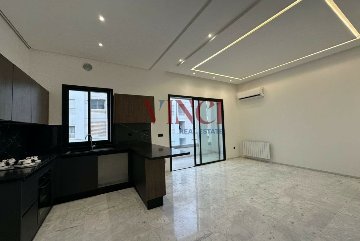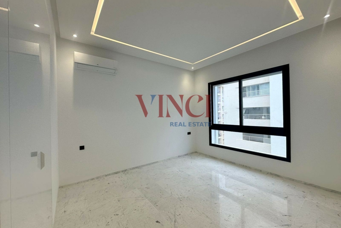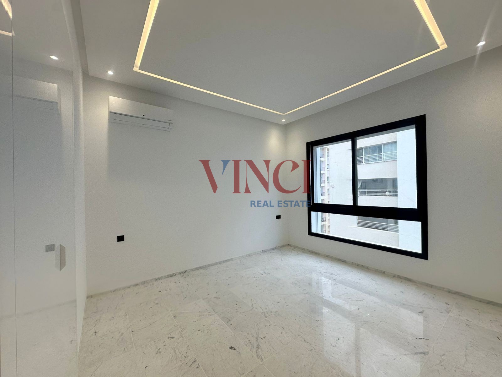 Cet appartement est situé au cinquième étage d’une résidence calme et sécurisée de sept niveaux. Il se compose d’un salon lumineux ouvrant sur une terrasse et dispose d’un chauffage central ainsi que de la climatisation. La cuisine ouverte est équipée d’une plaque de cuisson, d’un four électrique et d’une hotte aspirante. La partie nuit comprend une chambre à coucher avec dressing ainsi qu’une salle de douche