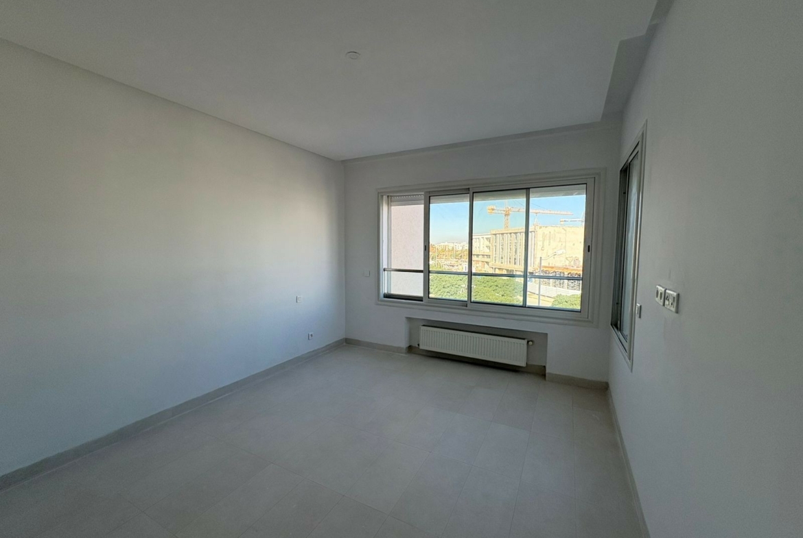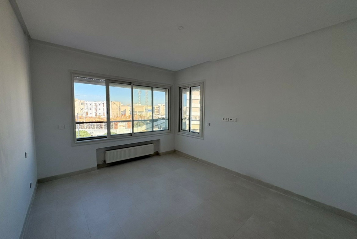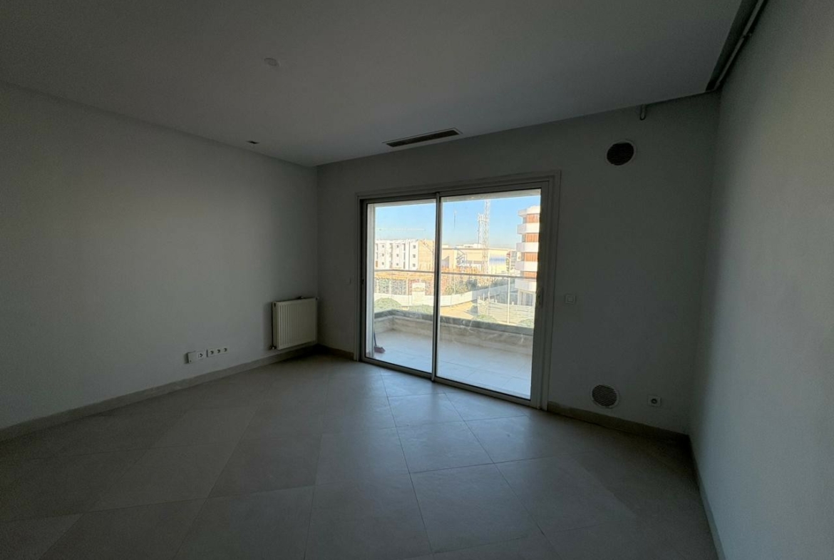 Un appartement en S+1 vide de 80 m², situé au 2ème étage d’une résidence sécurisée avec ascenseur aux Jardins de Carthage. Il comprend un salon lumineux ouvrant sur un balcon, une cuisine indépendante équipée, une chambre à coucher, un coin dressing au hall et une salle de douche commune. L’appartement est équipé de la climatisation et du chauffage central, et dispose d’une place de parking.