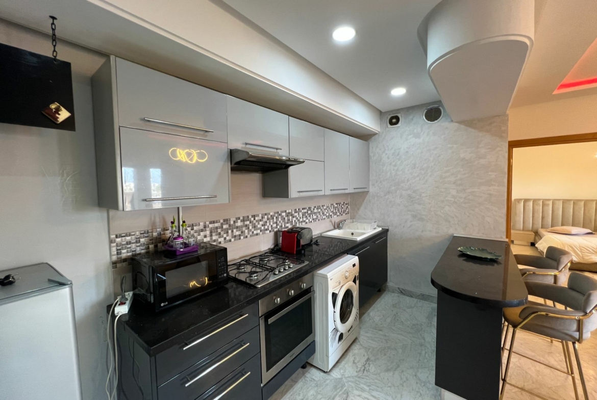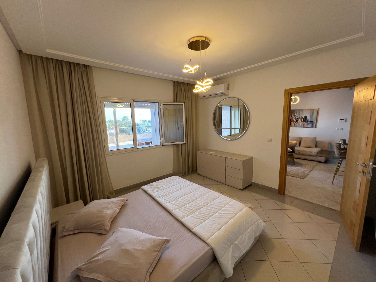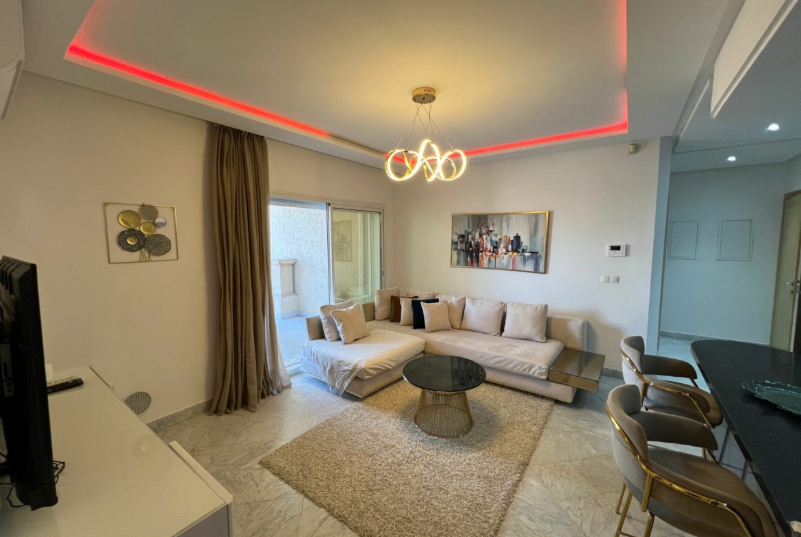 Appartement en S+1 meublé situé au 1er étage d’une résidence bien gardée, implantée dans une zone calme, avec double ascenseur, d’une superficie de 72 m². À l’entrée, un dressing encastré aménage le hall, donnant accès à une cuisine américaine entièrement équipée (plaque de cuisson, hotte, four, machine à laver, réfrigérateur, machine à café). Le salon lumineux s’ouvre sur une spacieuse terrasse de 50 m². L’appartement dispose également d’une chambre à coucher avec dressing, offrant une vue sur la terrasse, ainsi qu’une salle de douche. Il est équipé de la climatisation et du chauffage, et bénéficie d’un abri de voiture.