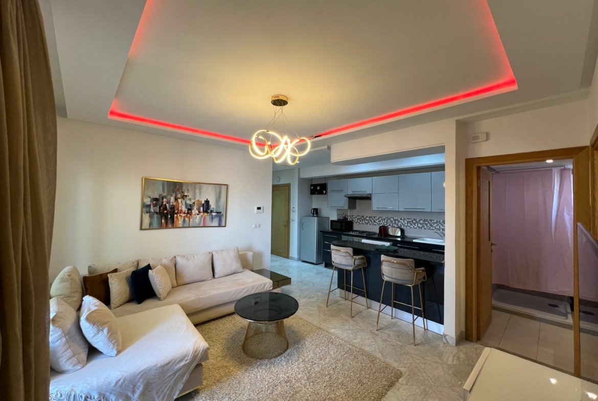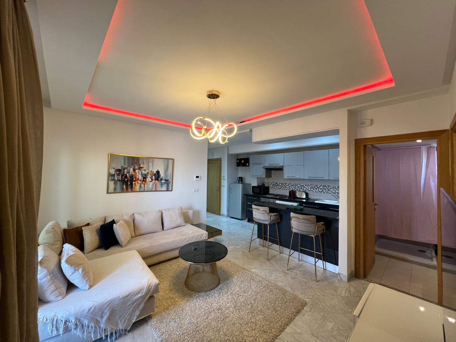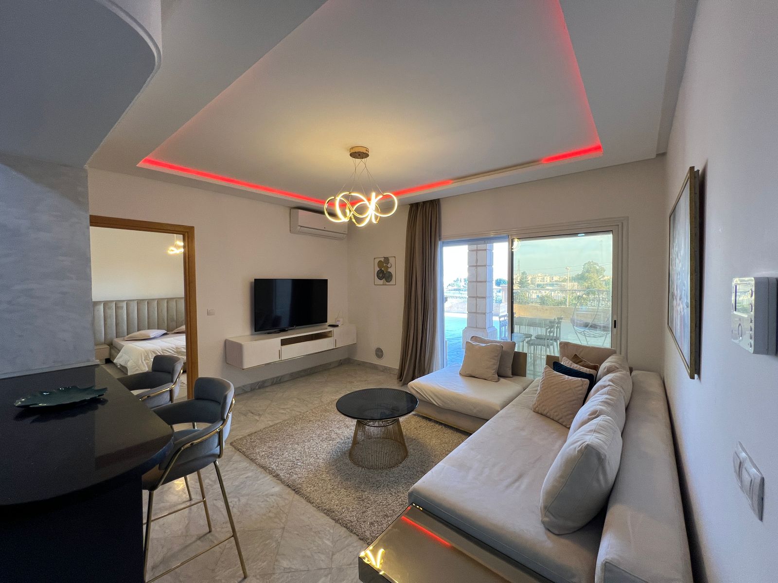 Appartement en S+1 meublé situé au 1er étage d’une résidence bien gardée, implantée dans une zone calme, avec double ascenseur, d’une superficie de 72 m². À l’entrée, un dressing encastré aménage le hall, donnant accès à une cuisine américaine entièrement équipée (plaque de cuisson, hotte, four, machine à laver, réfrigérateur, machine à café). Le salon lumineux s’ouvre sur une spacieuse terrasse de 50 m². L’appartement dispose également d’une chambre à coucher avec dressing, offrant une vue sur la terrasse, ainsi qu’une salle de douche. Il est équipé de la climatisation et du chauffage, et bénéficie d’un abri de voiture.