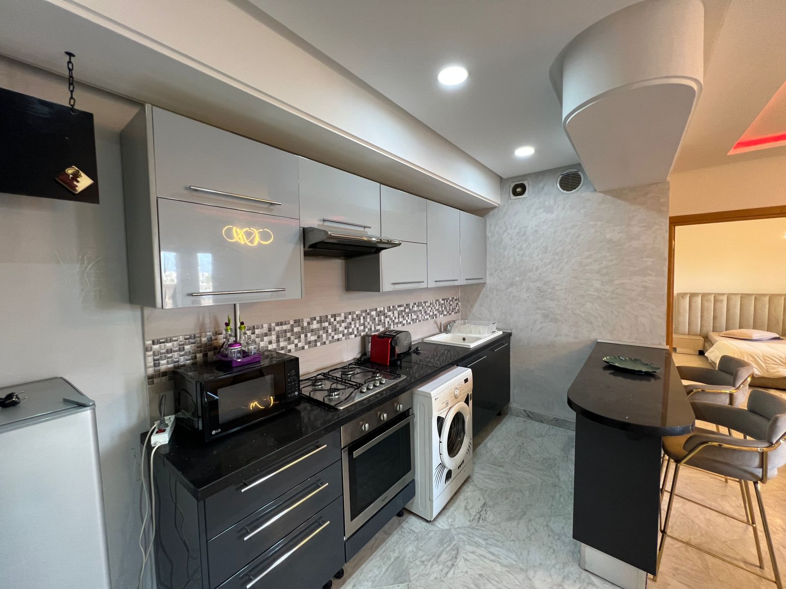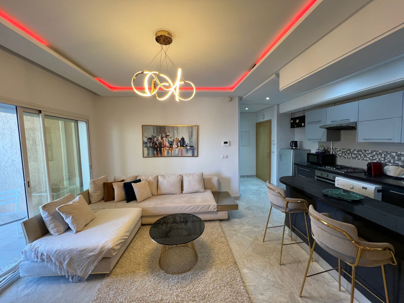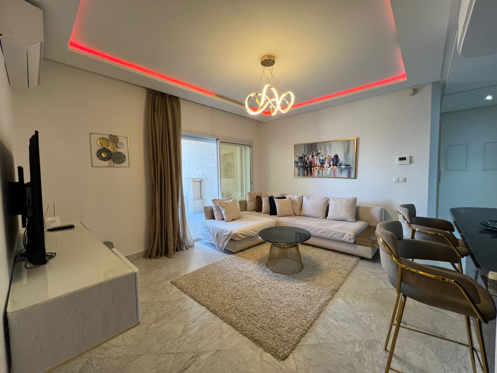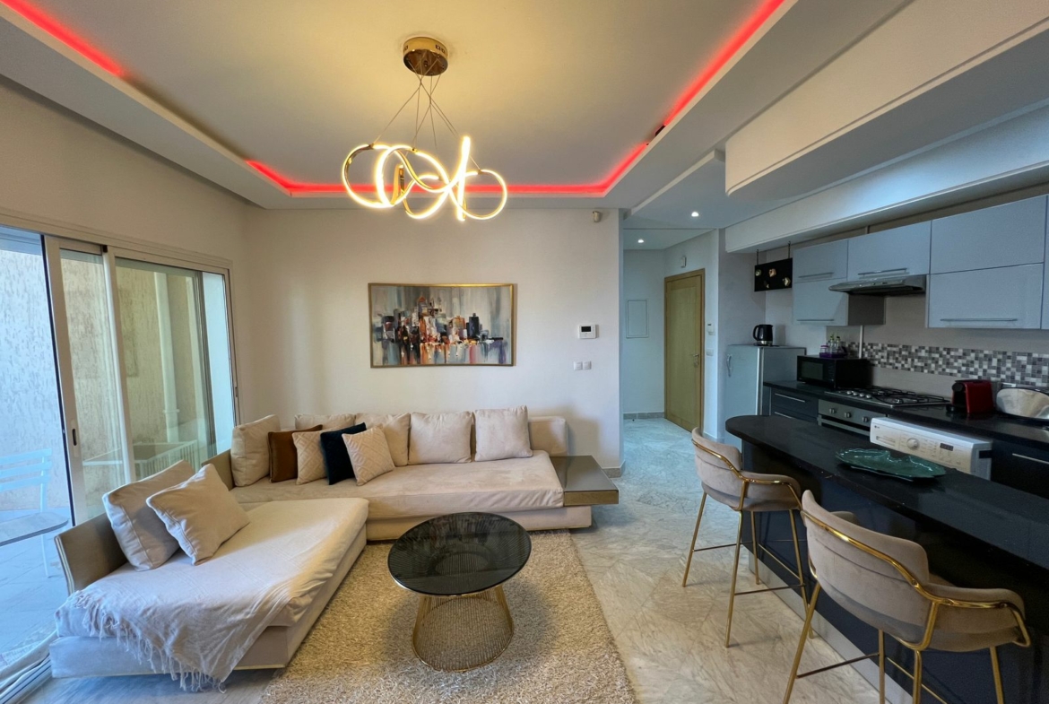 Appartement en S+1 meublé, situé au 2ème étage d’une résidence sécurisée et bien gardée avec ascenseur. Il se compose d’un hall d’entrée avec dressing, d’une cuisine ouverte entièrement équipée, d’un salon lumineux avec accès à la terrasse, d’une chambre avec dressing et d’une salle de douche. L’appartement est doté de climatisation et chauffage, et une place de parking au sous-sol est disponible.