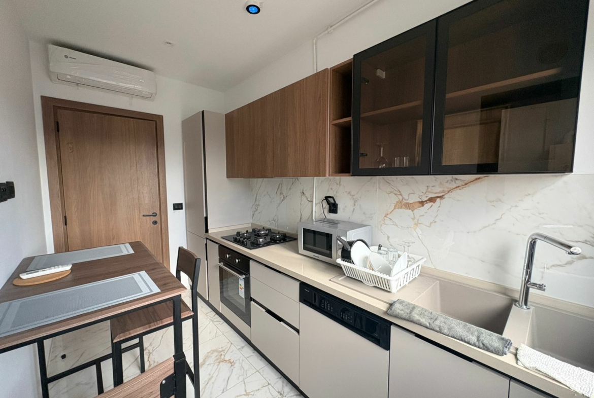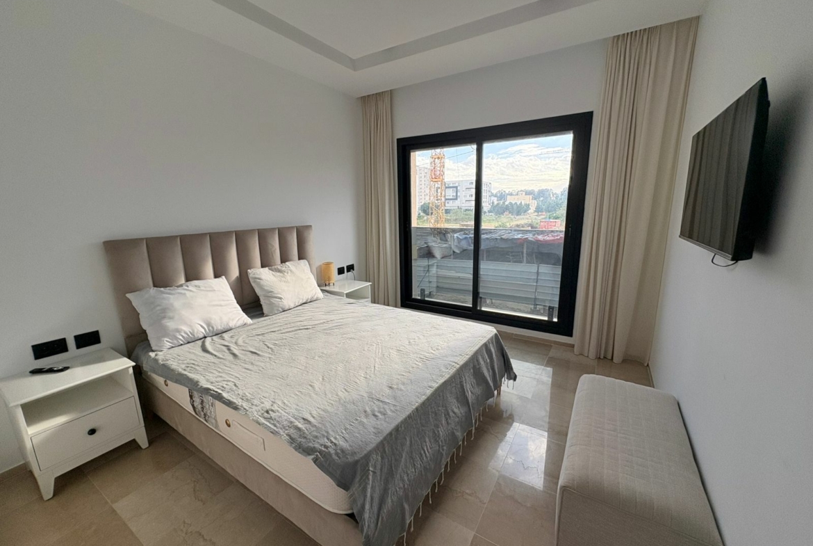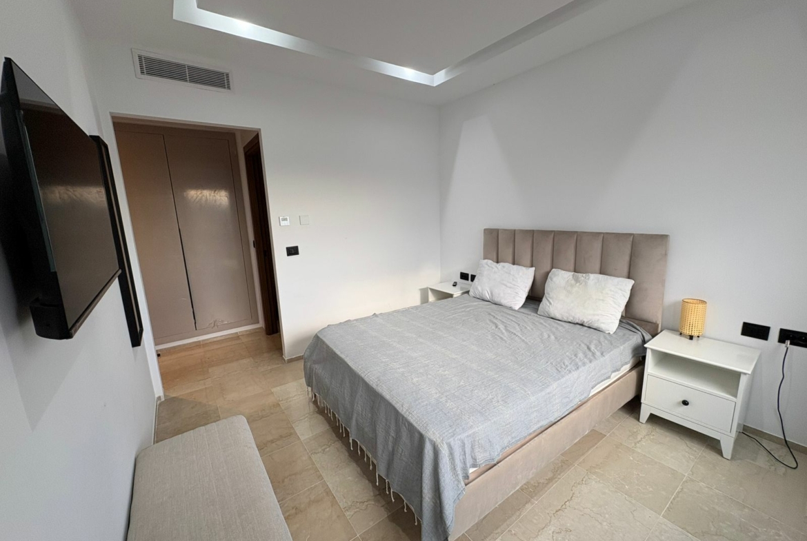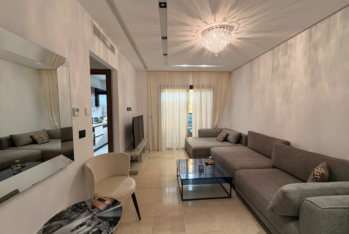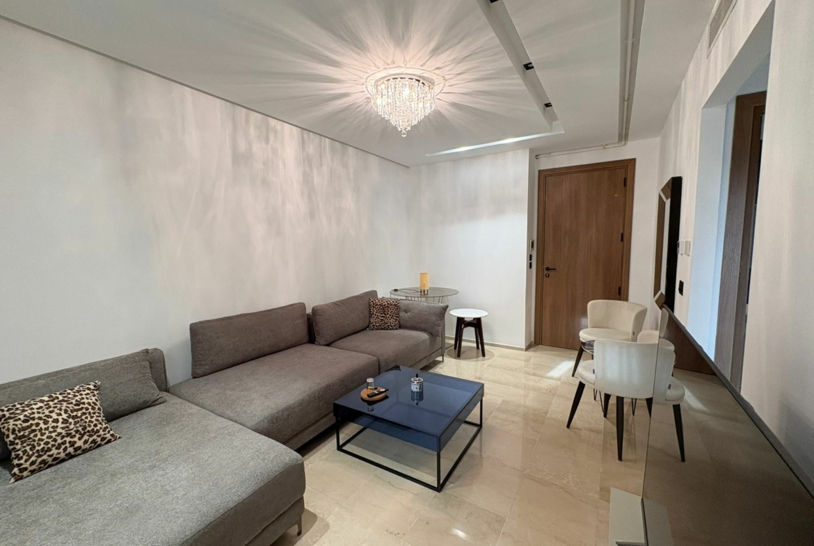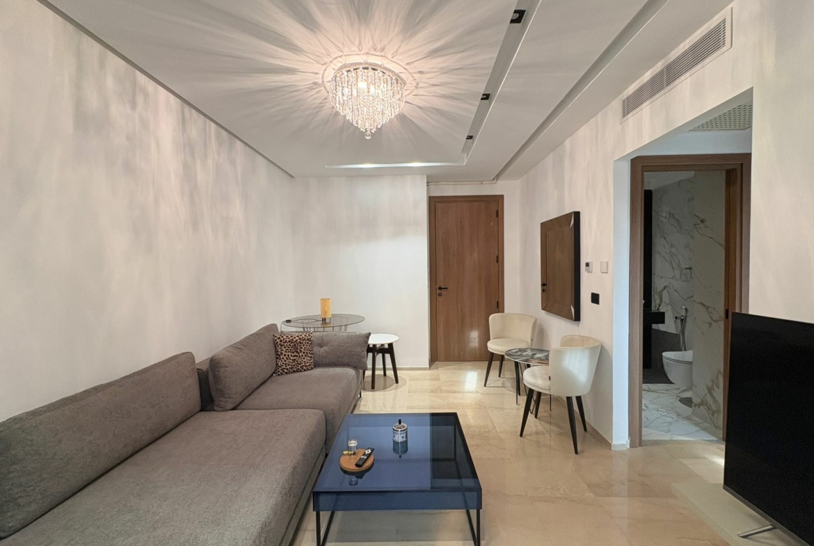 Appartement en S+1 meublé de standing moderne, situé au 1er étage d’une résidence récente et sécurisée, dotée de doubles ascenseurs, piscine et salle de sport. D’une superficie de 75 m², il se compose d’un salon lumineux avec accès à un balcon, d’une cuisine indépendante bien équipée (plaque, hotte, four, réfrigérateur) avec séchoir, ainsi que d’une suite parentale avec salle de douche. L’appartement est équipé de climatisation split et de chauffage central, avec une orientation sud-est assurant une excellente luminosité tout au long de la journée. Une place de parking est également disponible.