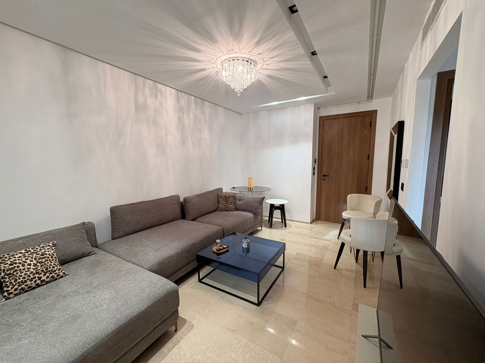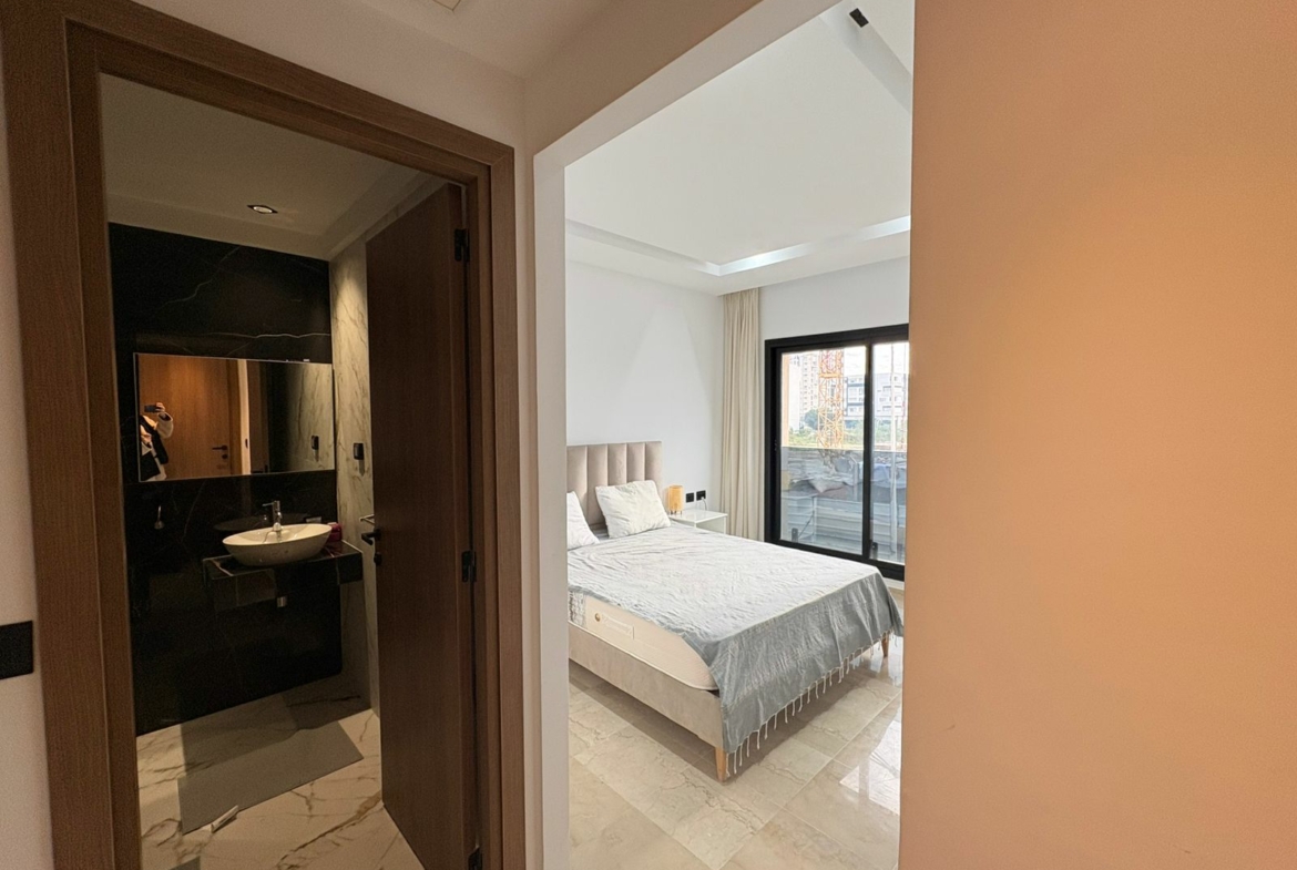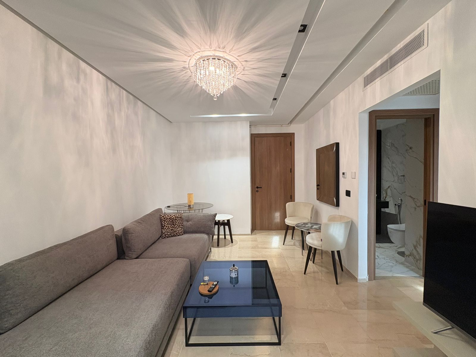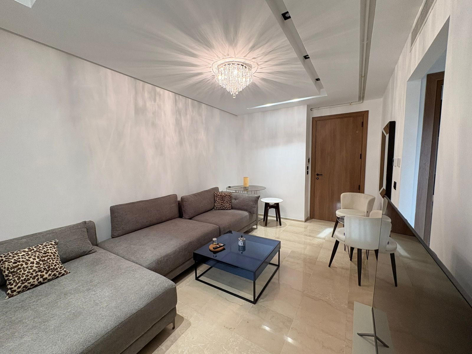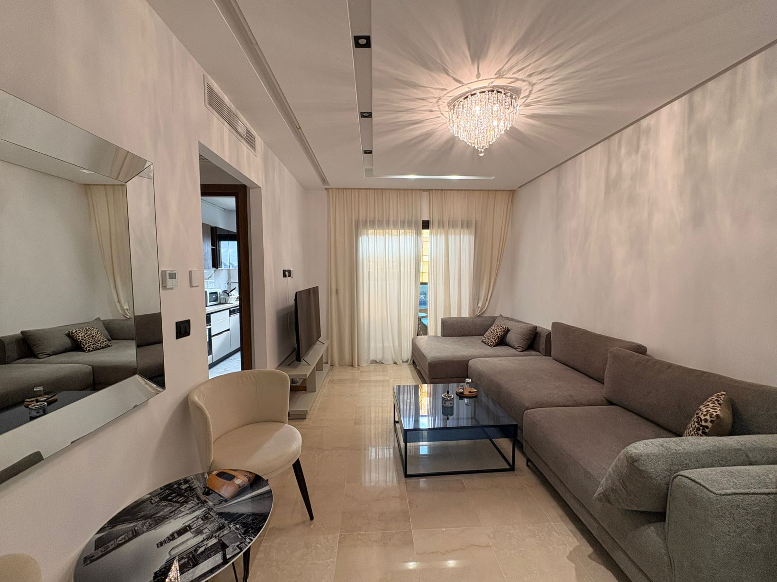 Appartement en S+1 meublé de standing moderne, situé au 1er étage d’une résidence récente et sécurisée, dotée de doubles ascenseurs, piscine et salle de sport. D’une superficie de 75 m², il se compose d’un salon lumineux avec accès à un balcon, d’une cuisine indépendante bien équipée (plaque, hotte, four, réfrigérateur) avec séchoir, ainsi que d’une suite parentale avec salle de douche. L’appartement est équipé de climatisation split et de chauffage central, avec une orientation sud-est assurant une excellente luminosité tout au long de la journée. Une place de parking est également disponible.