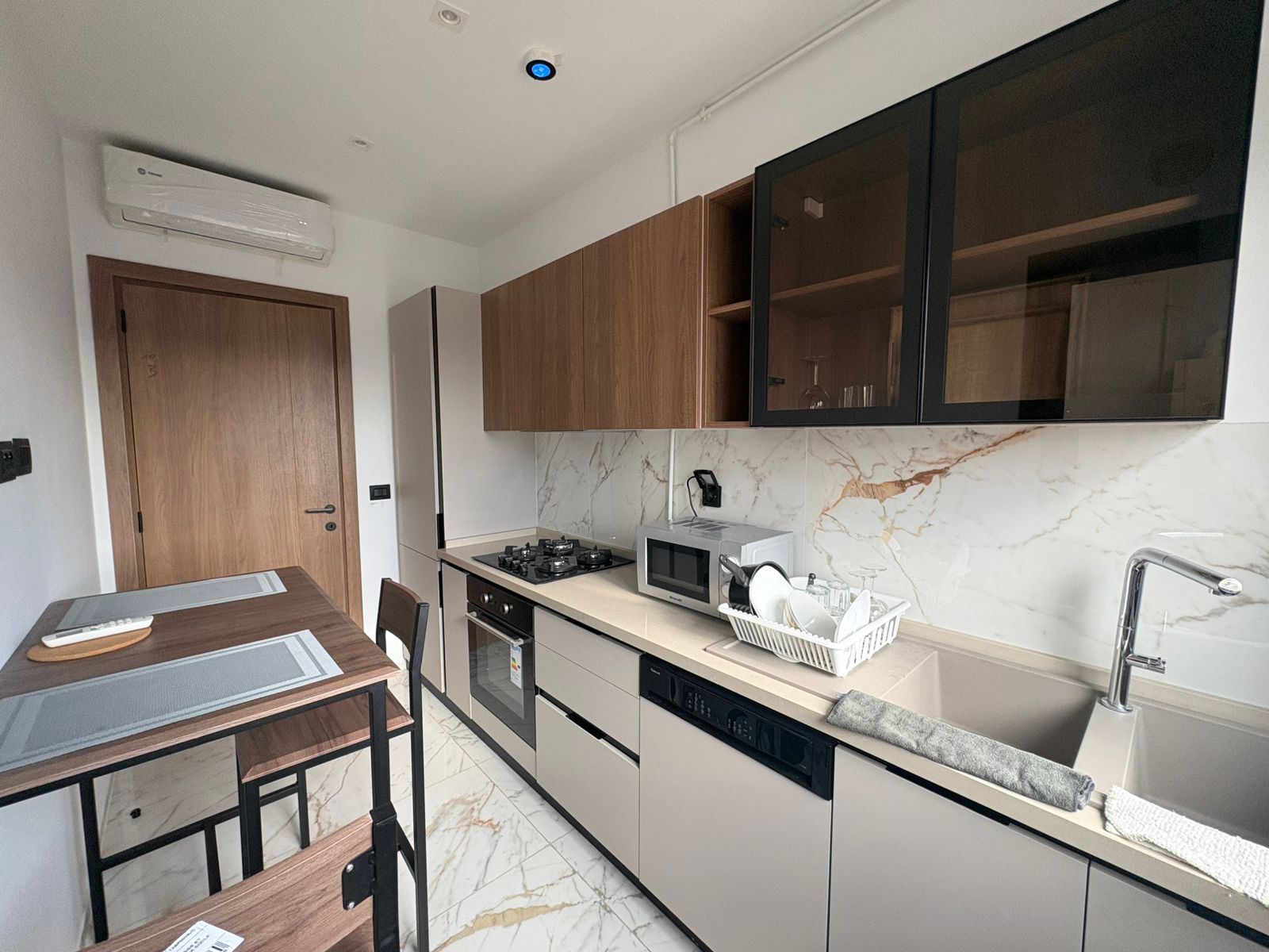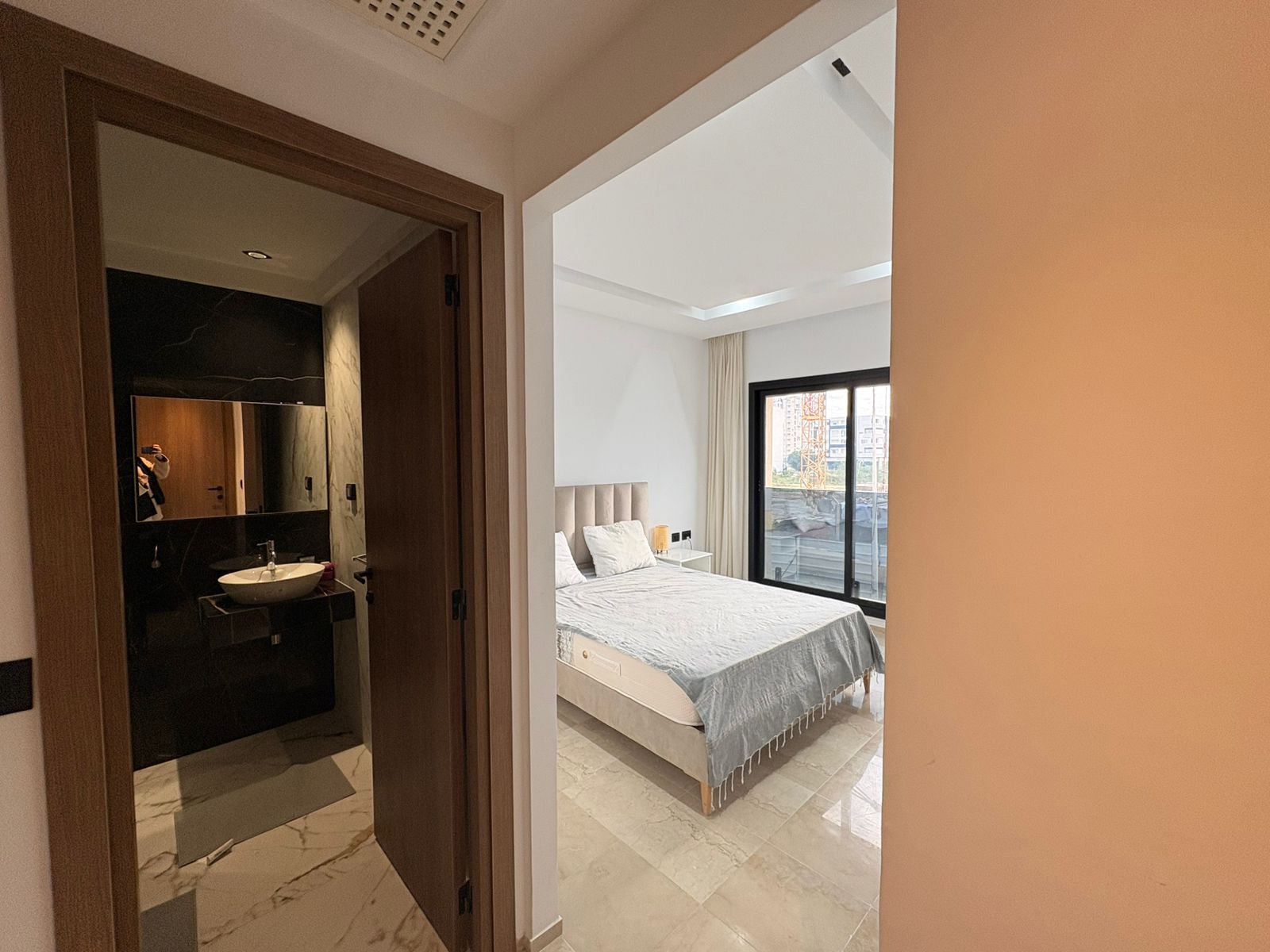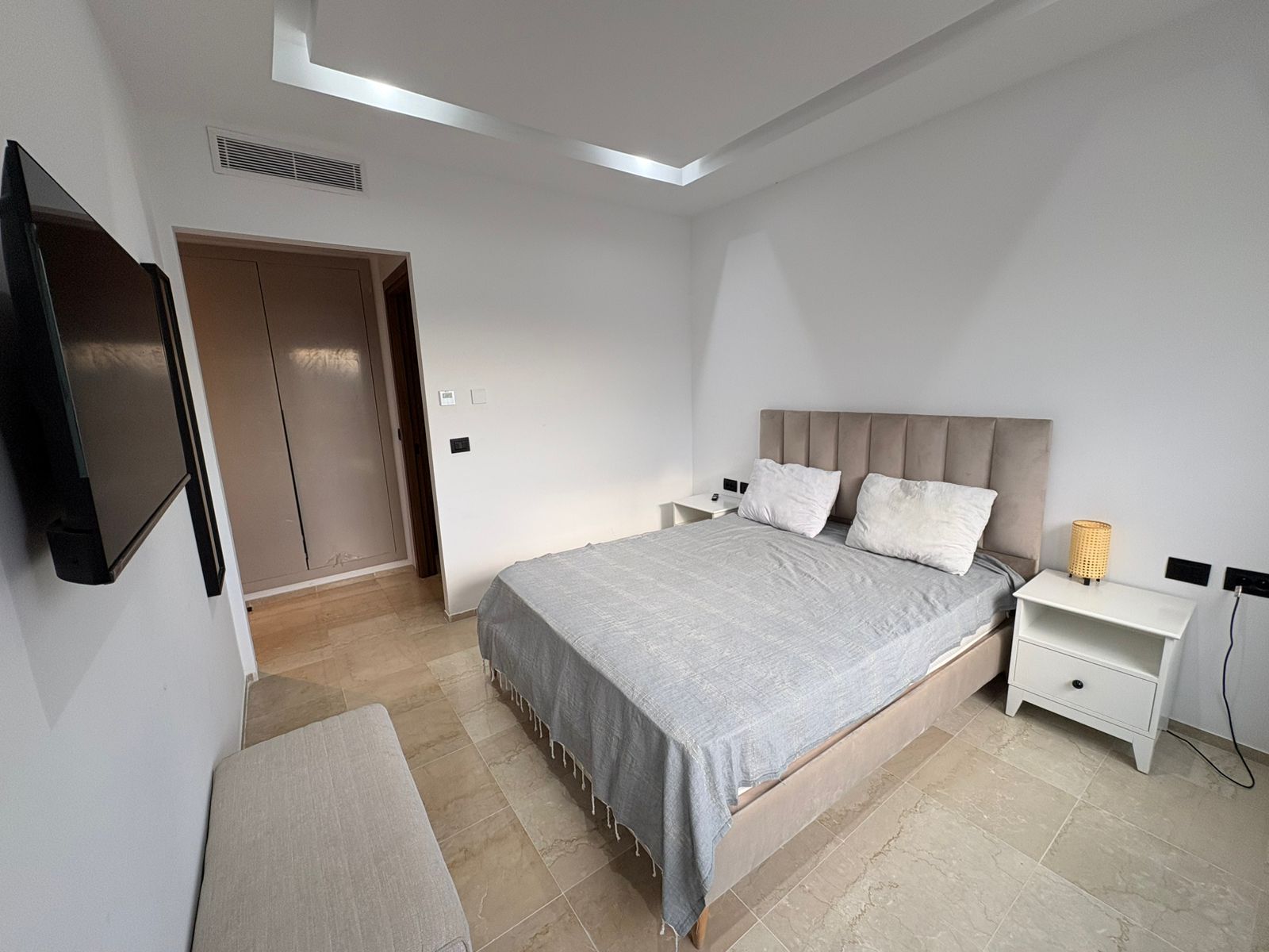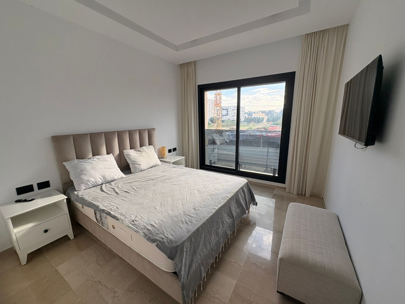 Appartement en S+1 meublé de standing moderne, situé au 1er étage d’une résidence récente et sécurisée, dotée de doubles ascenseurs, piscine et salle de sport. D’une superficie de 75 m², il se compose d’un salon lumineux avec accès à un balcon, d’une cuisine indépendante bien équipée (plaque, hotte, four, réfrigérateur) avec séchoir, ainsi que d’une suite parentale avec salle de douche. L’appartement est équipé de climatisation split et de chauffage central, avec une orientation sud-est assurant une excellente luminosité tout au long de la journée. Une place de parking est également disponible.