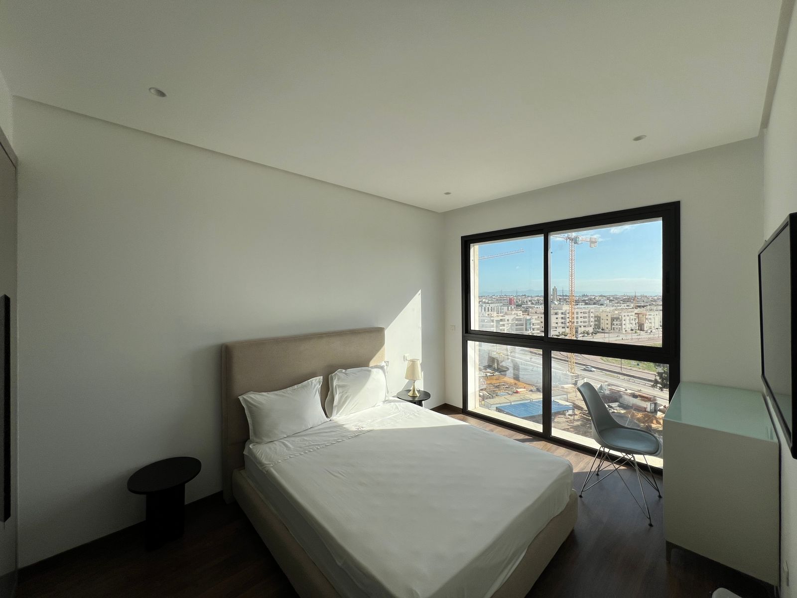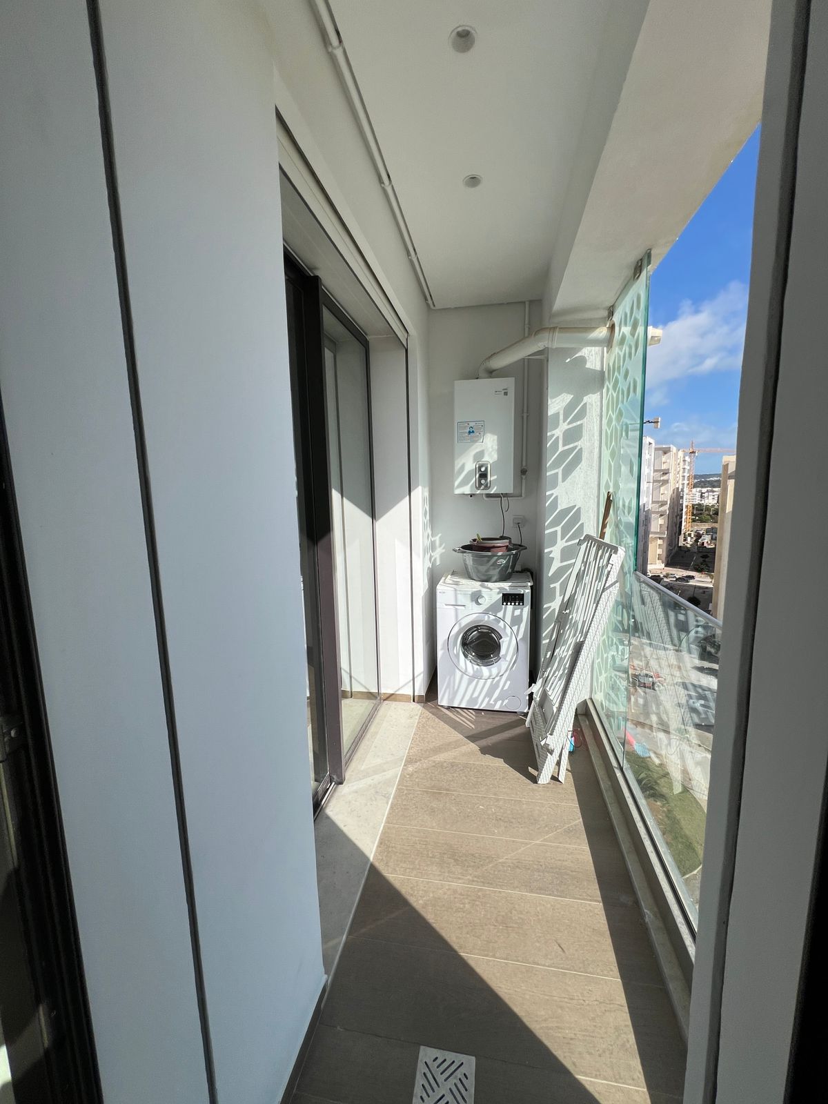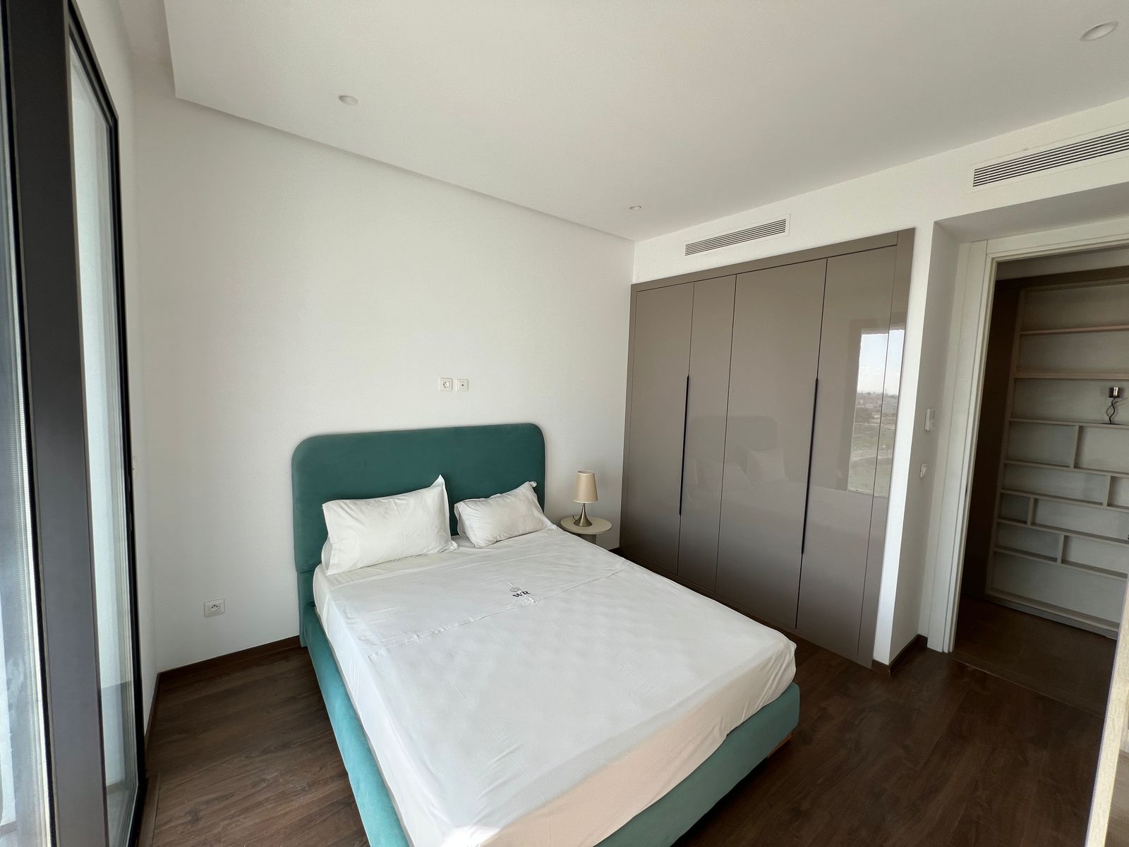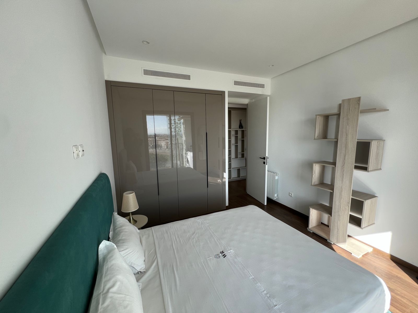 Appartement en S+2 meublé situé au 7ème étage d’une résidence sécurisée, équipée d’une piscine commune, d’une salle de jeux pour enfants et de deux ascenseurs. Il se compose d’un salon lumineux avec accès à un balcon, d’une cuisine ouverte, et d’une partie nuit totalement séparée comprenant un dressing encastré dans le hall, deux chambres à coucher avec dressing, dont une avec balcon, ainsi qu’une salle de douche commune. L’appartement est doté du chauffage et de la climatisation et dispose d’une place de parking au sous-sol. Idéal pour une location confortable dans un cadre résidentiel de qualité.