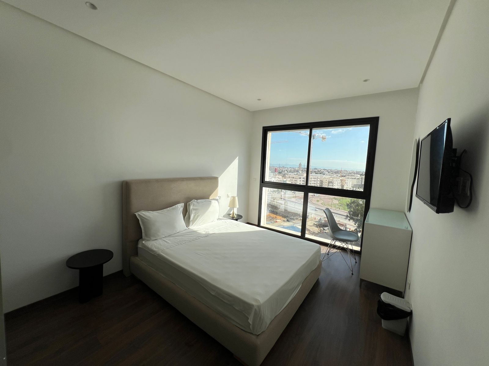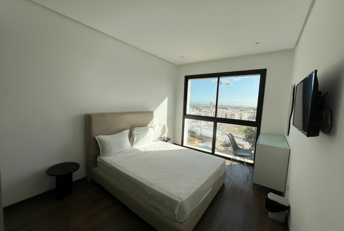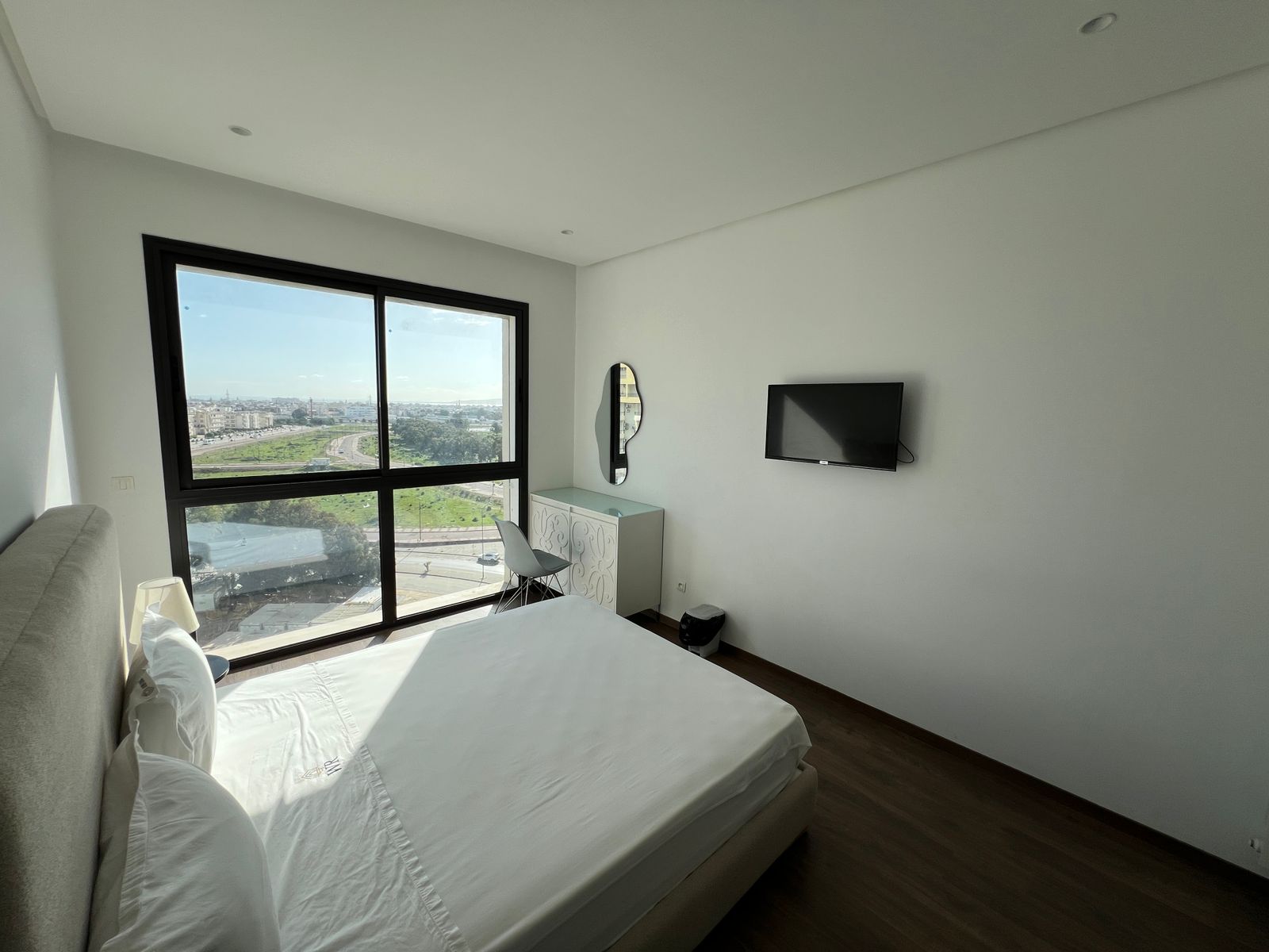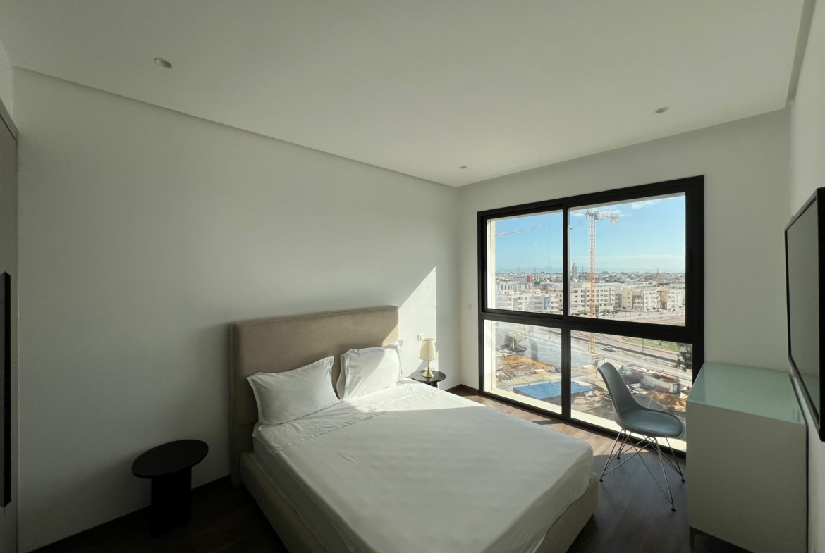 Appartement en S+2 meublé situé au 7ème étage d’une résidence sécurisée, équipée d’une piscine commune, d’une salle de jeux pour enfants et de deux ascenseurs. Il se compose d’un salon lumineux avec accès à un balcon, d’une cuisine ouverte, et d’une partie nuit totalement séparée comprenant un dressing encastré dans le hall, deux chambres à coucher avec dressing, dont une avec balcon, ainsi qu’une salle de douche commune. L’appartement est doté du chauffage et de la climatisation et dispose d’une place de parking au sous-sol. Idéal pour une location confortable dans un cadre résidentiel de qualité.