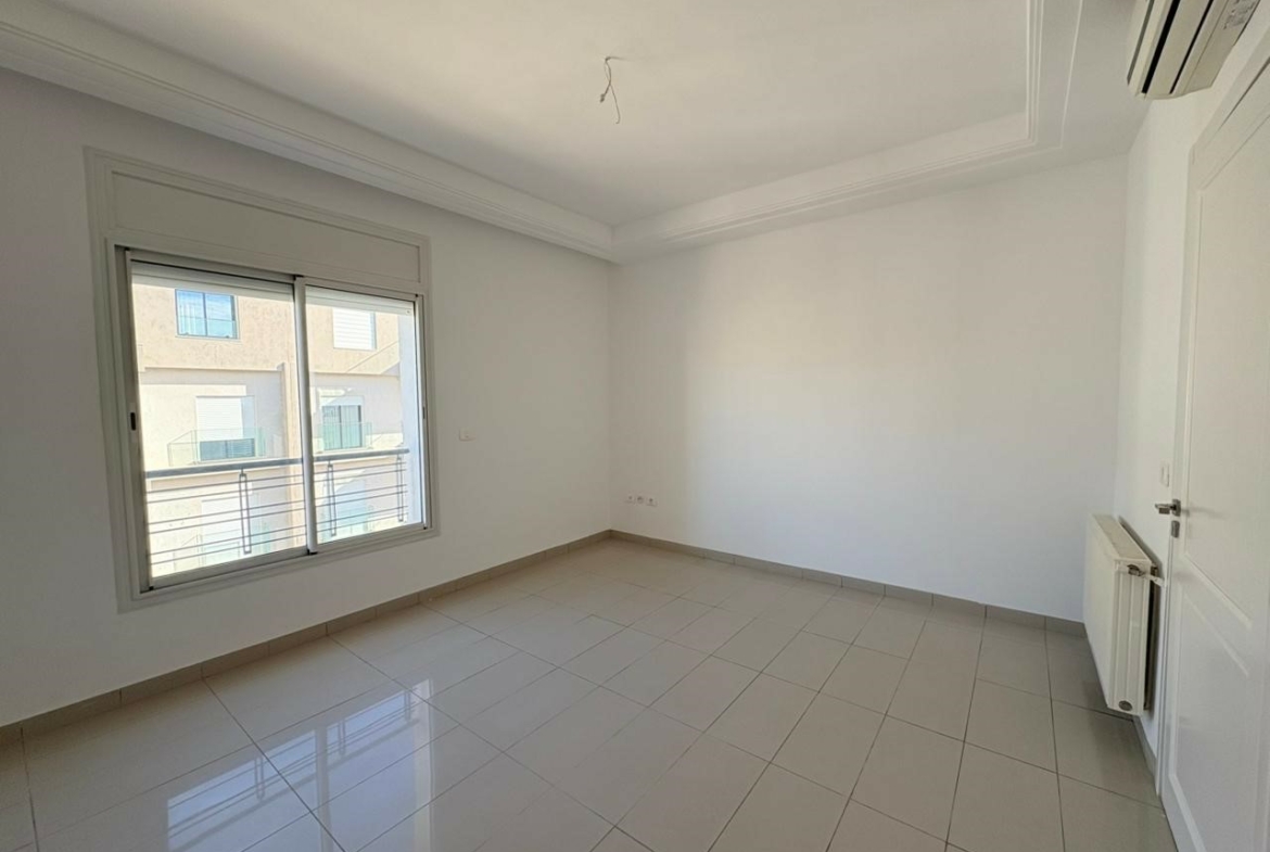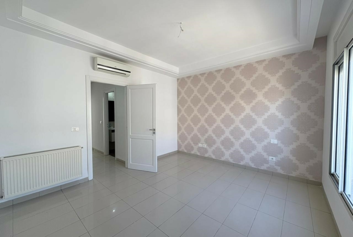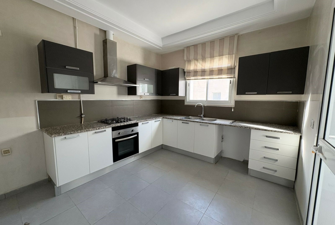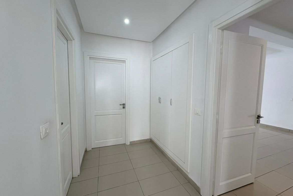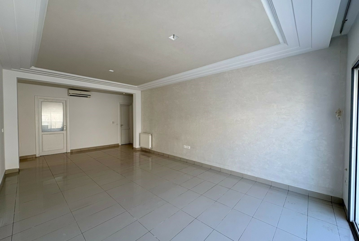 Appartement S+2 vide situé au 3ème étage d’une résidence bien gardée, équipée de double ascenseur. D’une superficie de 137 m², il se compose d’un salon spacieux avec balcon, offrant la possibilité d’aménager deux espaces salons, de deux chambres à coucher dont une avec dressing, d’une salle d’eau pour les invités et d’une salle de bain commune. L’appartement est doté de la climatisation split et du chauffage central. Une place de parking au sous-sol est incluse.
