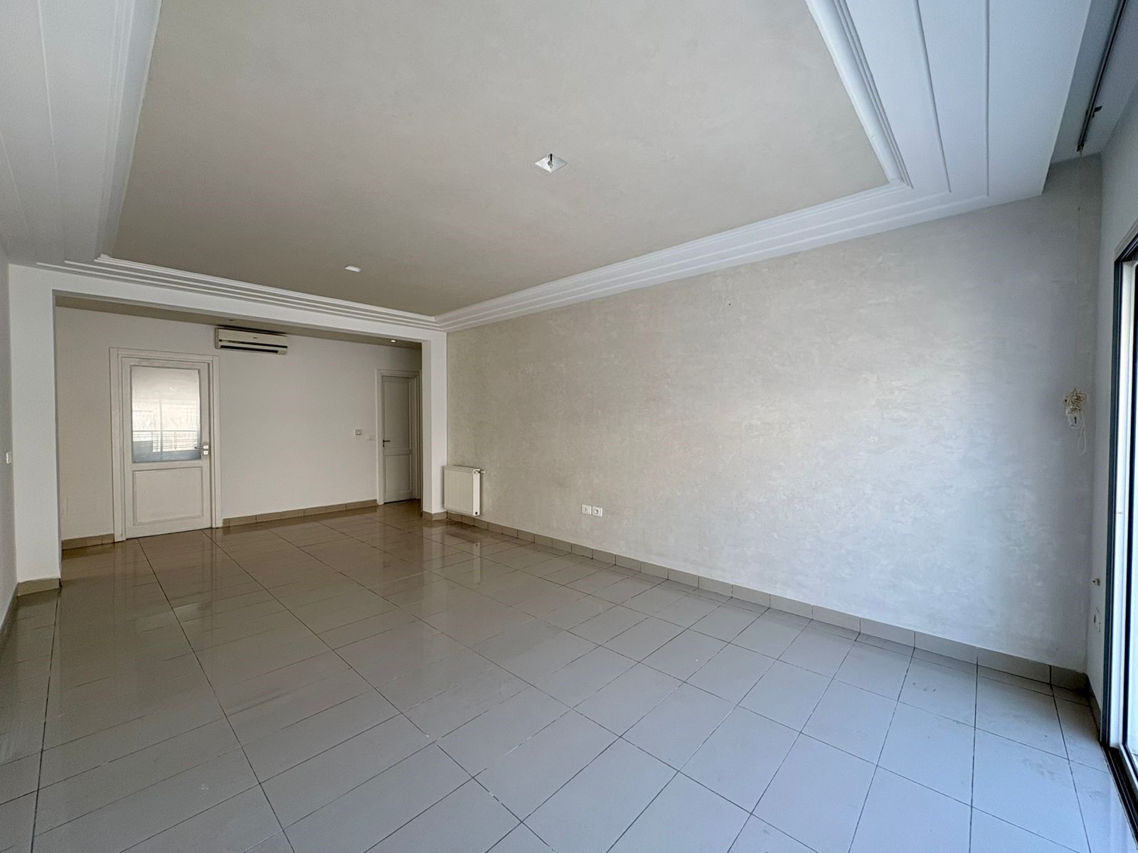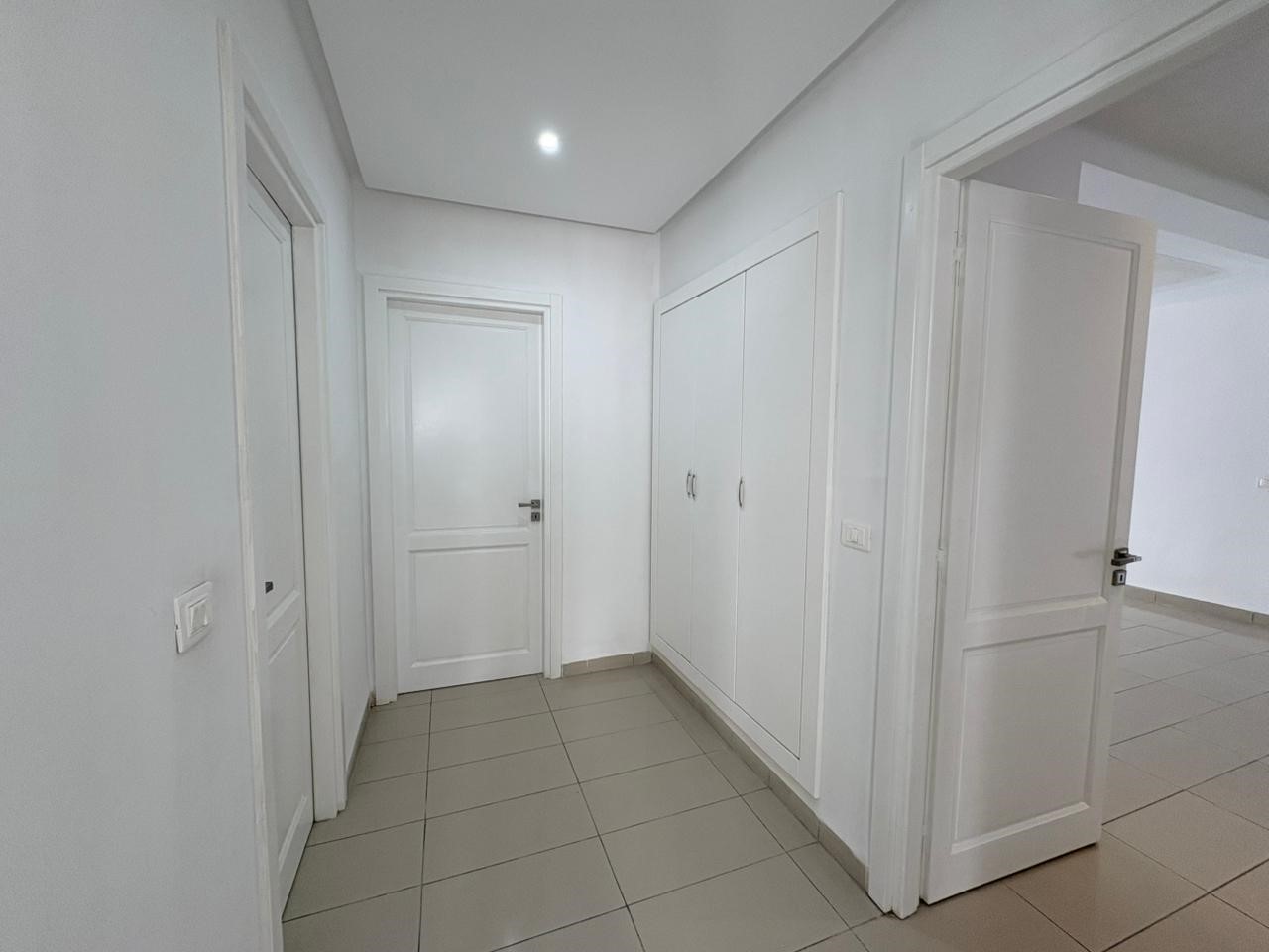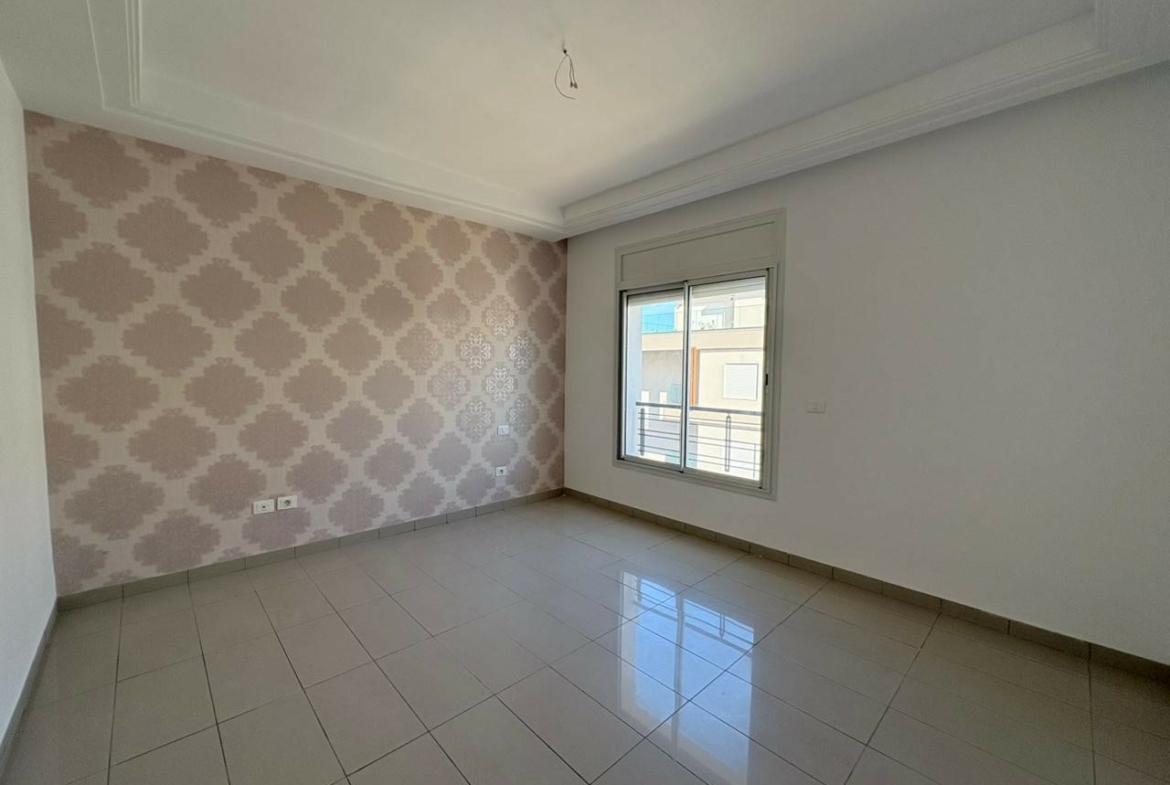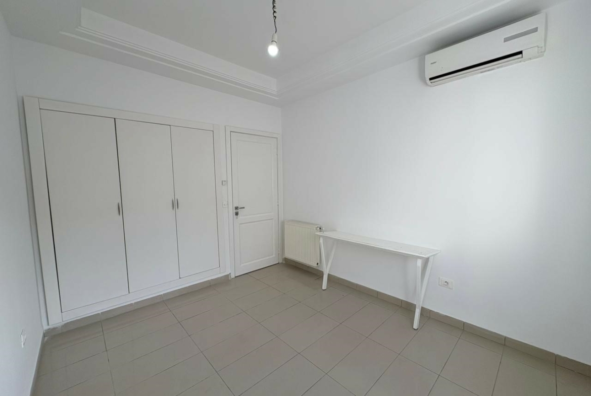 Appartement S+2 vide situé au 3ème étage d’une résidence bien gardée, équipée de double ascenseur. D’une superficie de 137 m², il se compose d’un salon spacieux avec balcon, offrant la possibilité d’aménager deux espaces salons, de deux chambres à coucher dont une avec dressing, d’une salle d’eau pour les invités et d’une salle de bain commune. L’appartement est doté de la climatisation split et du chauffage central. Une place de parking au sous-sol est incluse.