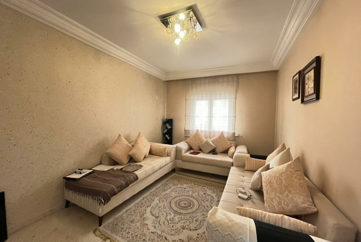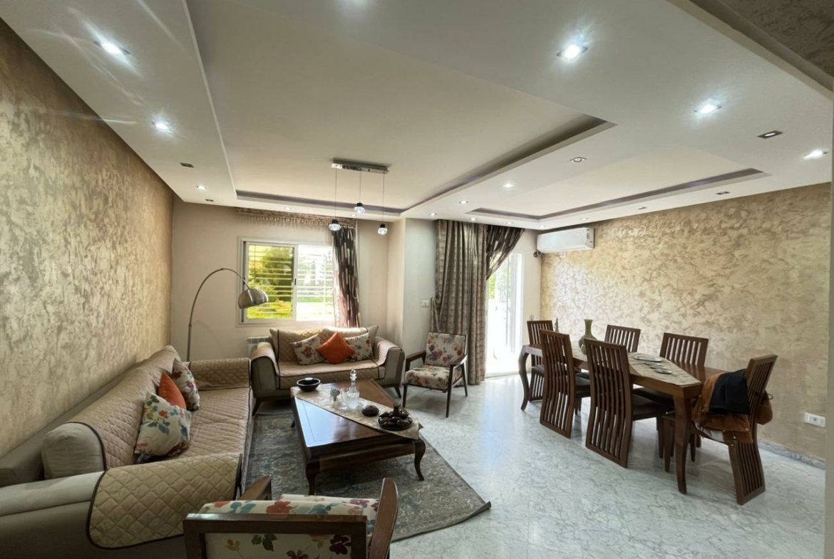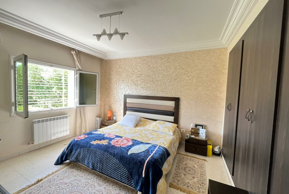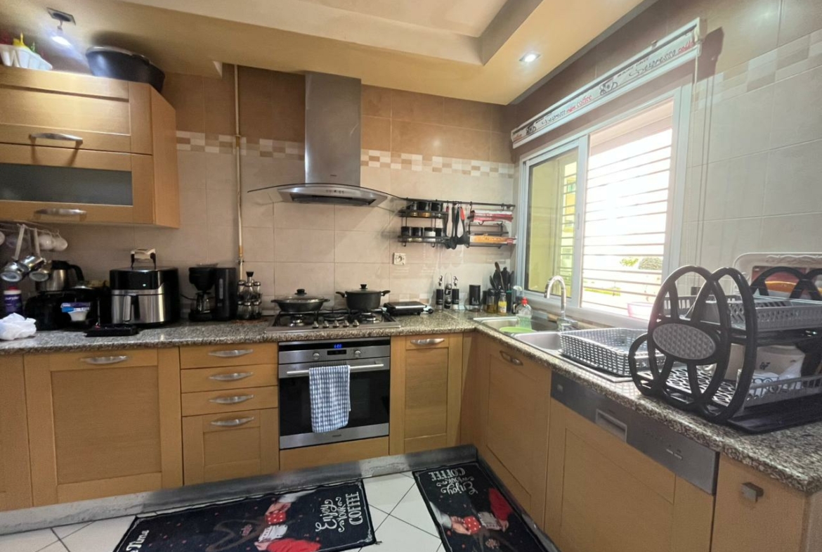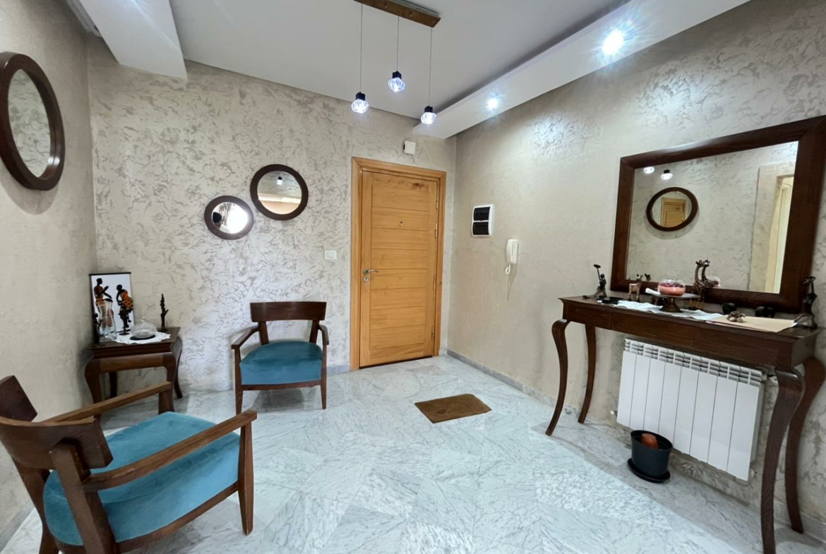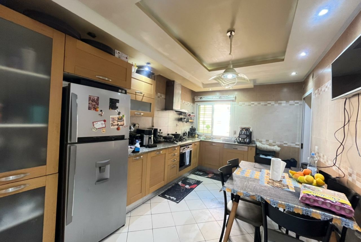 Cet appartement S+4 de 175m² situé à Ezzahra. Dès l’entrée, vous serez accueilli par un hall qui mène vers une pièce de vie spacieuse, idéale pour aménager un salon et une salle à manger s’ouvrent sur un terrasse. La cuisine est équipée par des éléments de rangement, plaque, hotte et four avec séchoirUne salle de douche est également disponible pour les invités . La partie nuit se compose de quatre chambres à coucherUne salle de bain commune est également disponible.
