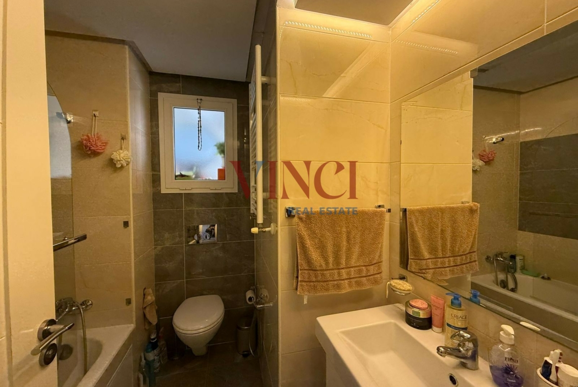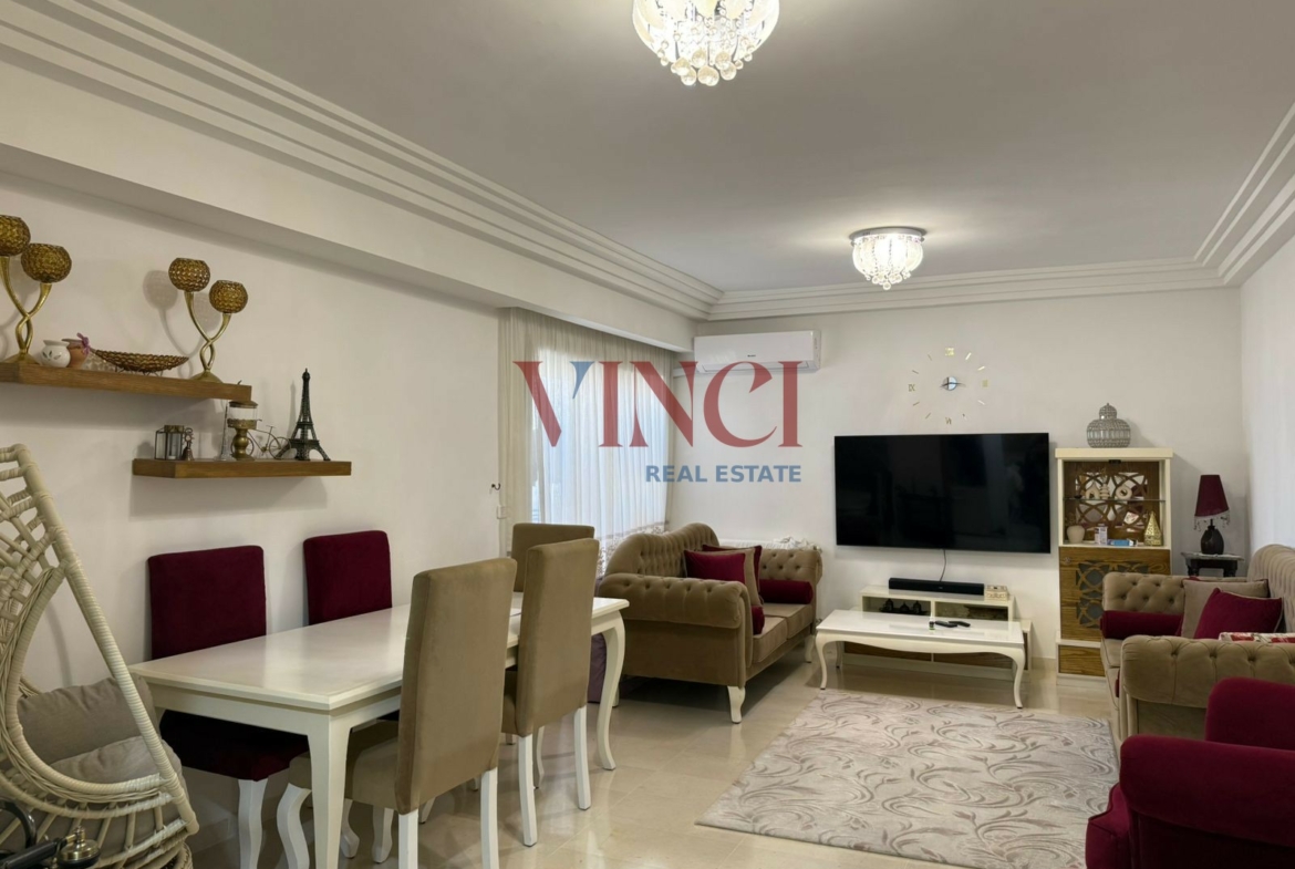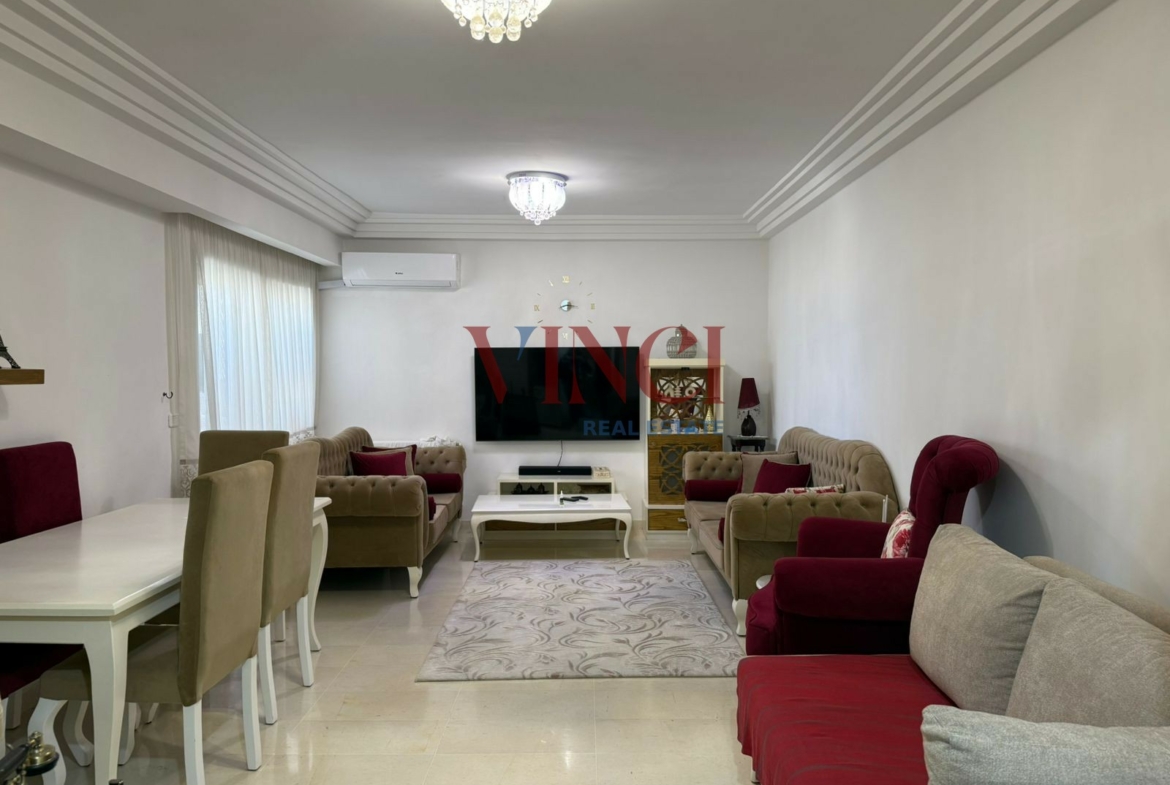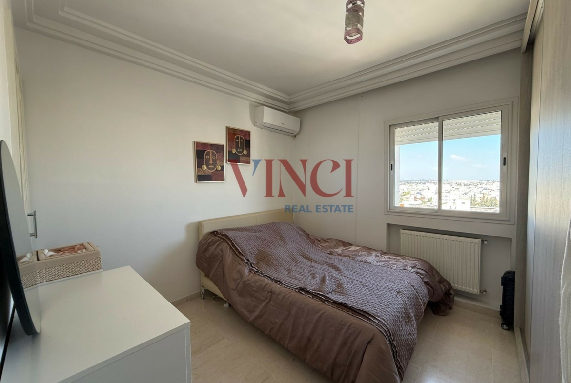 l’appartement disose d’un salon lumineux qui s’ouvre sur un balcon , une cuisine bien aménagée et équipée . la partie nuit dispose de deux chambres à coucher et une salle de bain