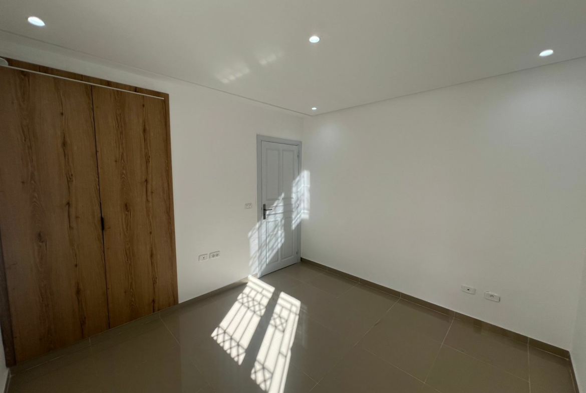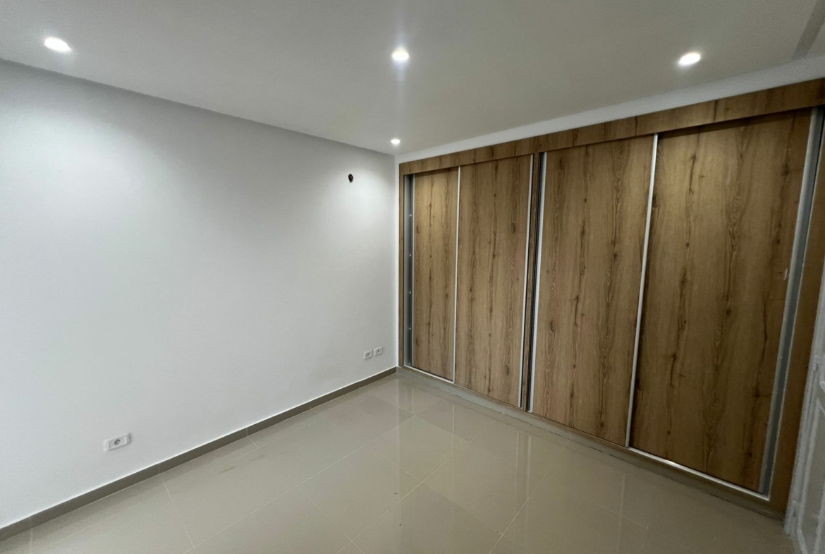 L’entrée donne sur une pièce de vie lumineuse, grâce à son ouverture sur un balcon. La cuisine est équipée d’une plaque de cuisson et d’une hotte. Un séchoir est disponible pour plus de fonctionnalité. La partie nuit à loge trois chambres à coucher avec dressing, dont une suite parentale avec dressing et salle de douche privative. Une salle de douche commune complète cet espace.