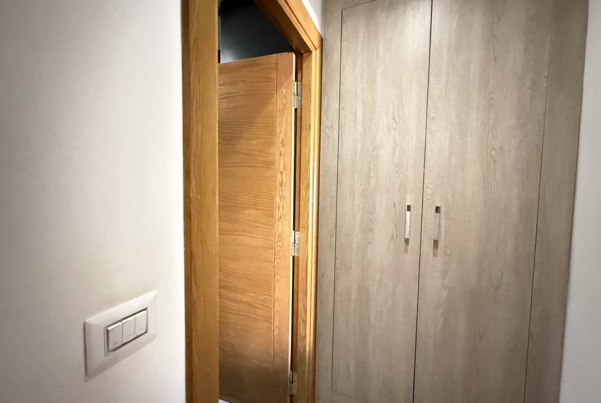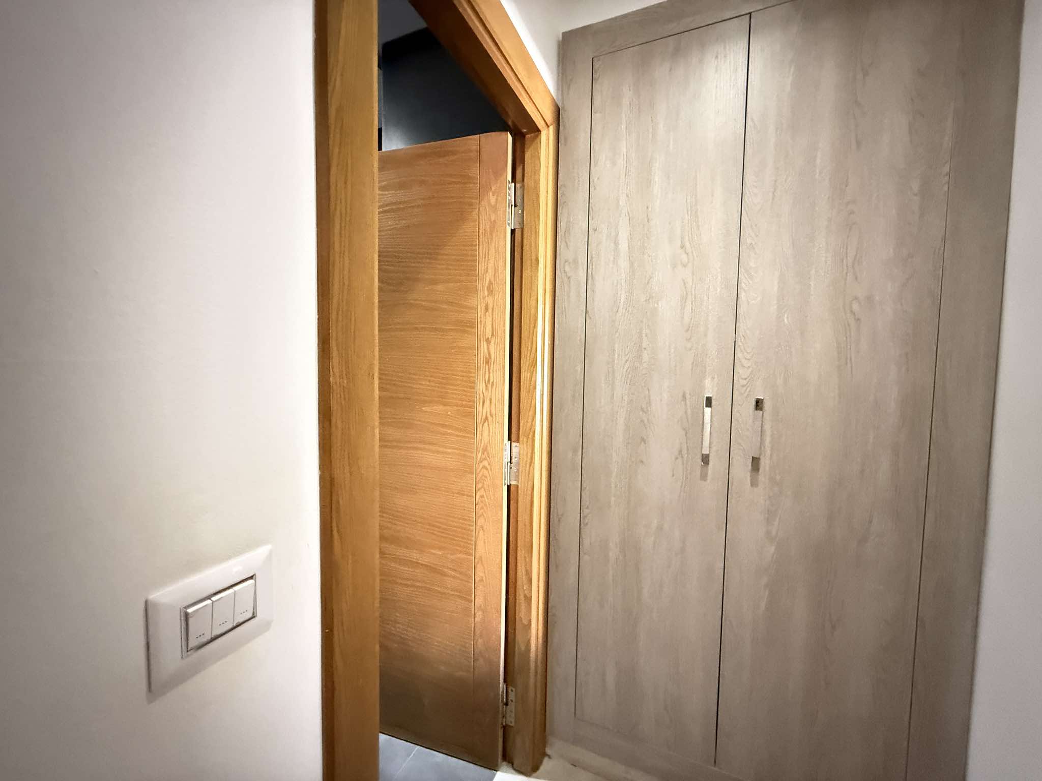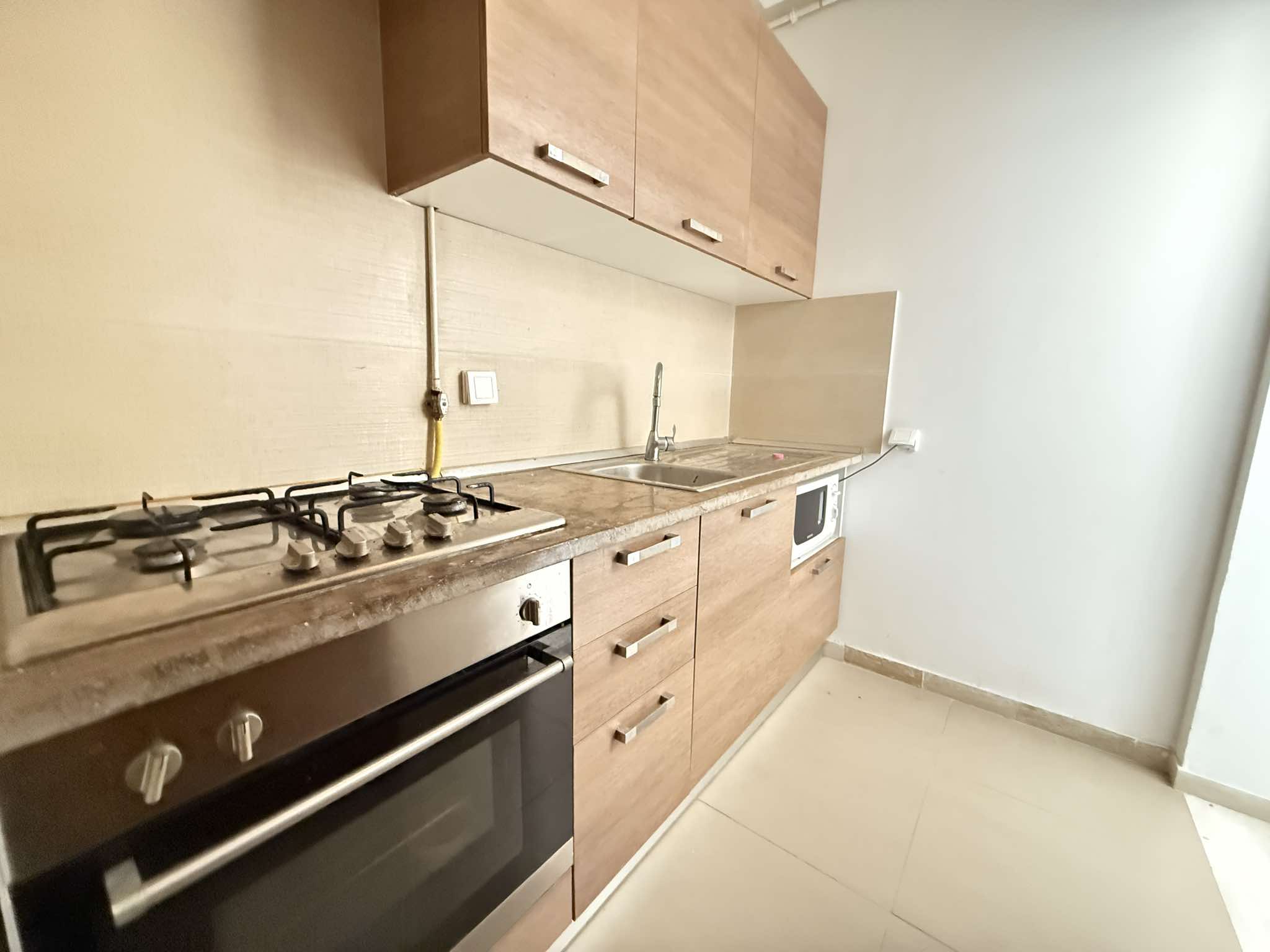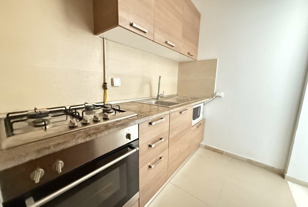 La pièce de réception, lumineuse grâce à son ouverture sur un balcon, est aménagée avec deux canapés, une table basse et une télévision. La cuisine, entièrement aménagée et équipée d’une plaque de cuisson, d’une hotte aspirante, d’un four électrique et d’un réfrigérateur, dispose d’un accès direct au séchoir.