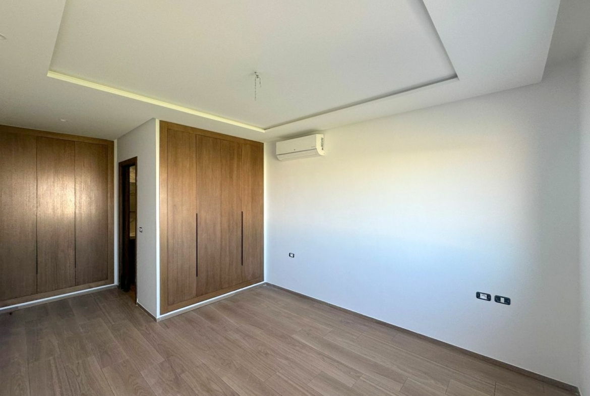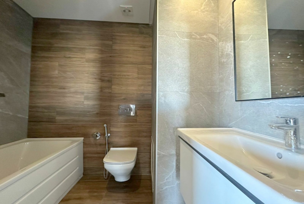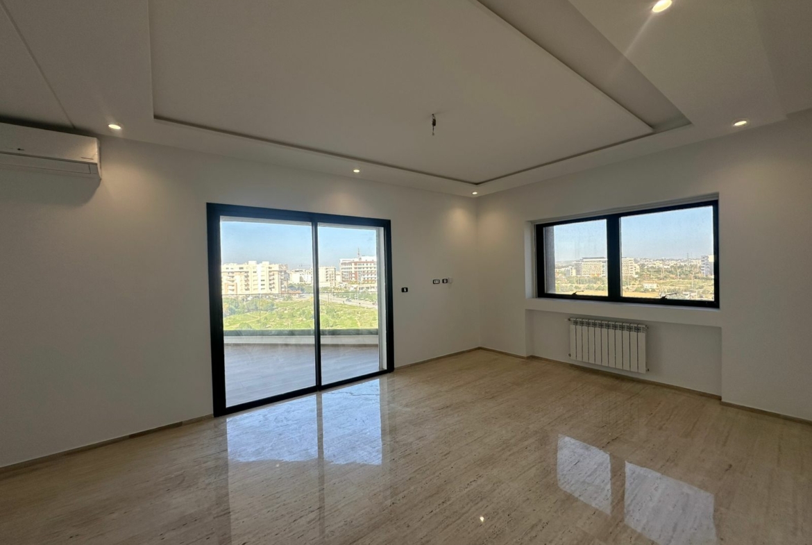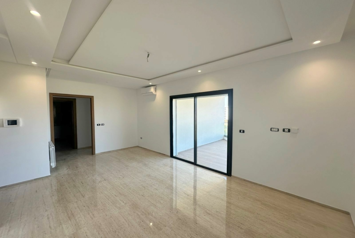 Cet appartement jamais habité est situé au cinquième étage dans une résidence récemment construite, équipée par une salle de sport commune. L’entrée donne sur un salon lumineux donne accès à une terrasse, bénéficiant d’une vue dégagée. La cuisine est aménagée de plusieurs espaces de rangement, équipée d’une plaque de cuisson, un four électrique et une hotte aspirante, complétée par un séchoir exploitable. La partie nuit se compose d’une suite parentale avec sa propre salle de douche, une chambre à coucher avec dressing ainsi qu’une salle de bain. L’appartement est équipé du chauffage central et une climatisation en multi split. Une place de parking est réservée au sous-sol.