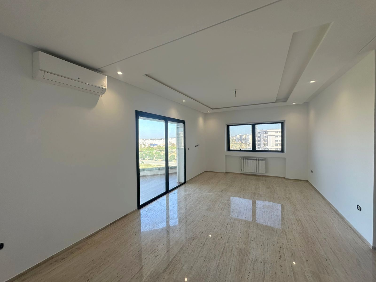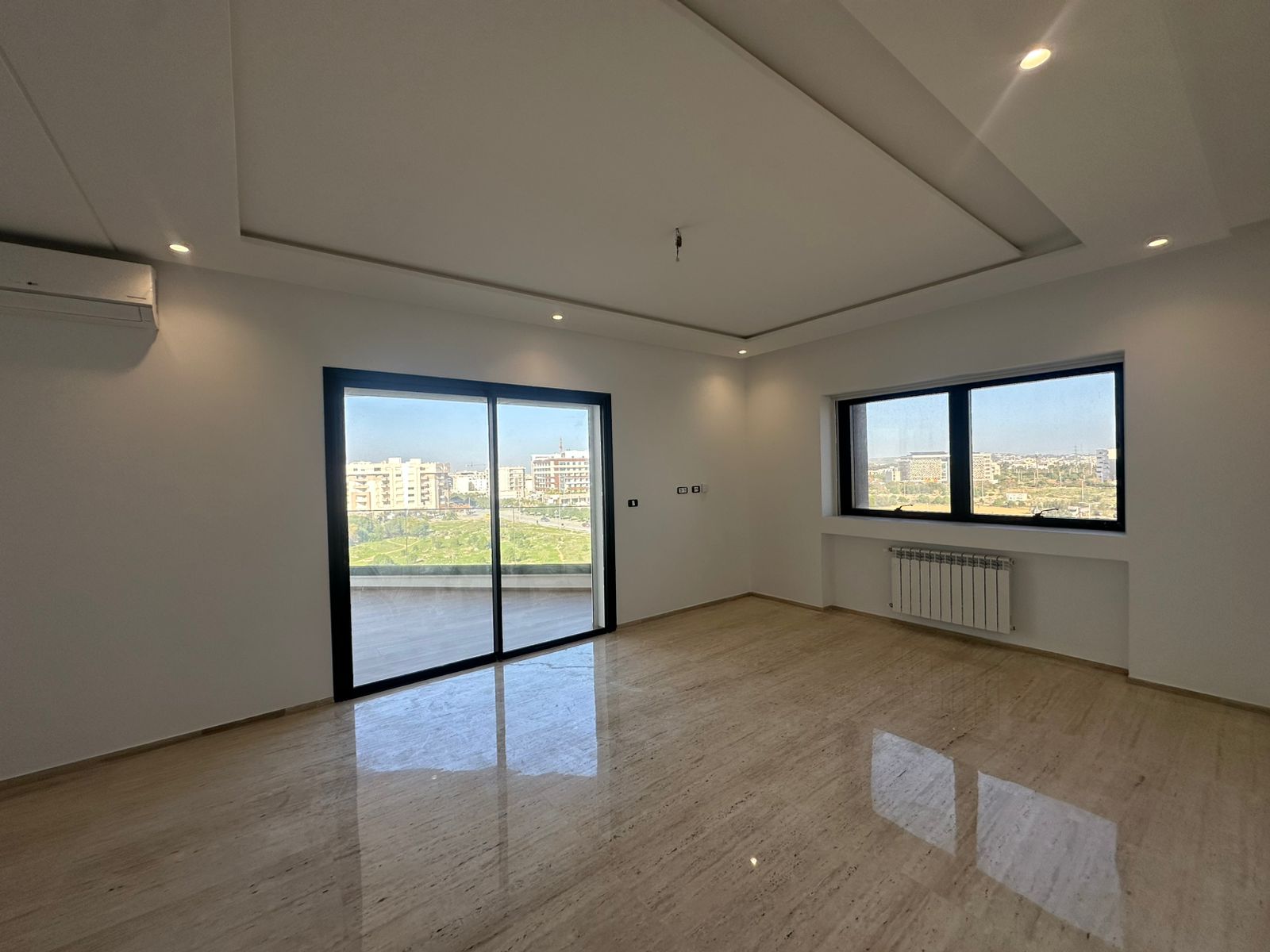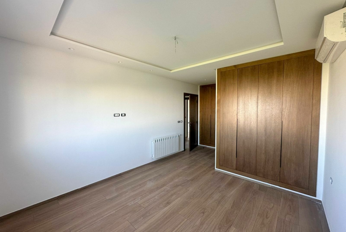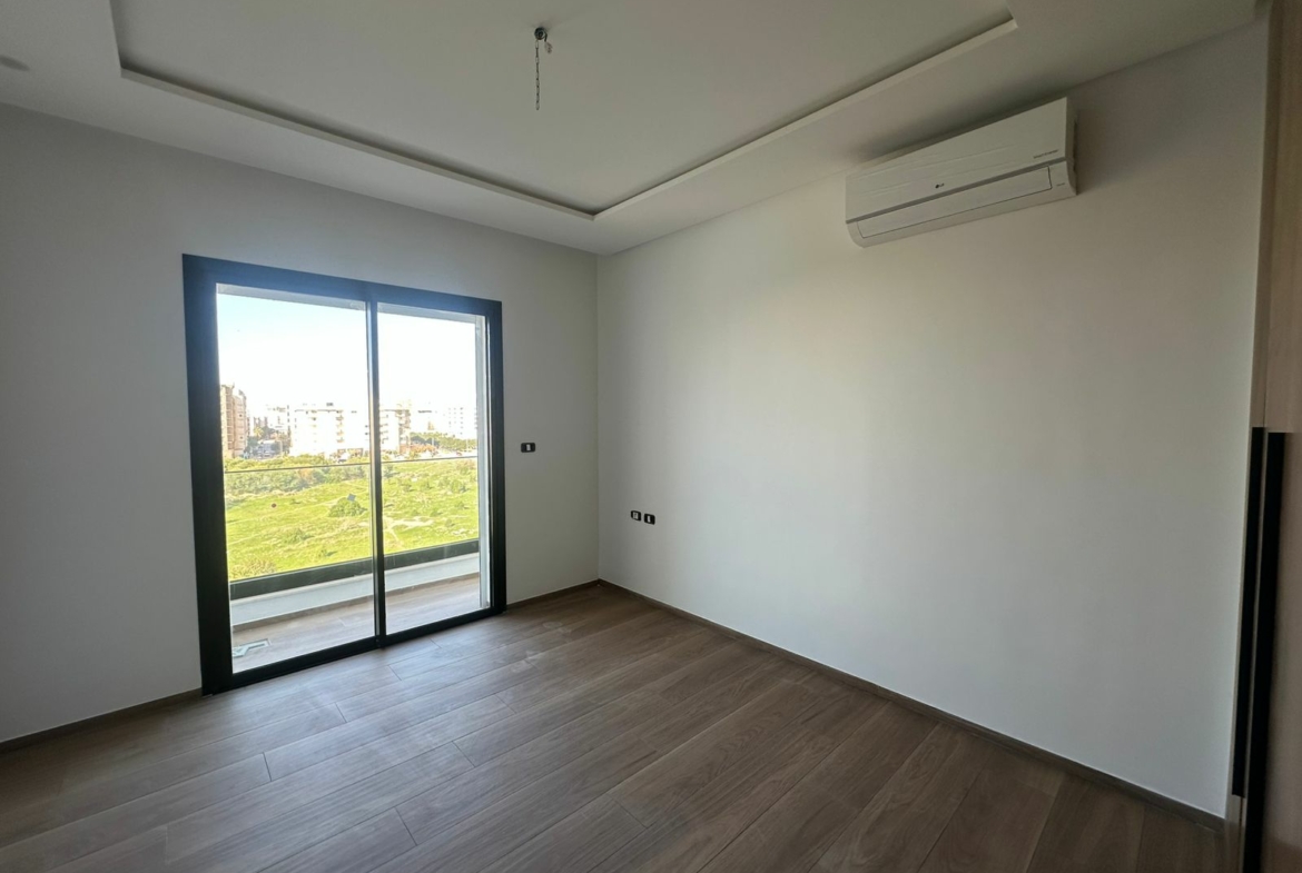 Cet appartement jamais habité est situé au cinquième étage dans une résidence récemment construite, équipée par une salle de sport commune. L’entrée donne sur un salon lumineux donne accès à une terrasse, bénéficiant d’une vue dégagée. La cuisine est aménagée de plusieurs espaces de rangement, équipée d’une plaque de cuisson, un four électrique et une hotte aspirante, complétée par un séchoir exploitable. La partie nuit se compose d’une suite parentale avec sa propre salle de douche, une chambre à coucher avec dressing ainsi qu’une salle de bain. L’appartement est équipé du chauffage central et une climatisation en multi split. Une place de parking est réservée au sous-sol.