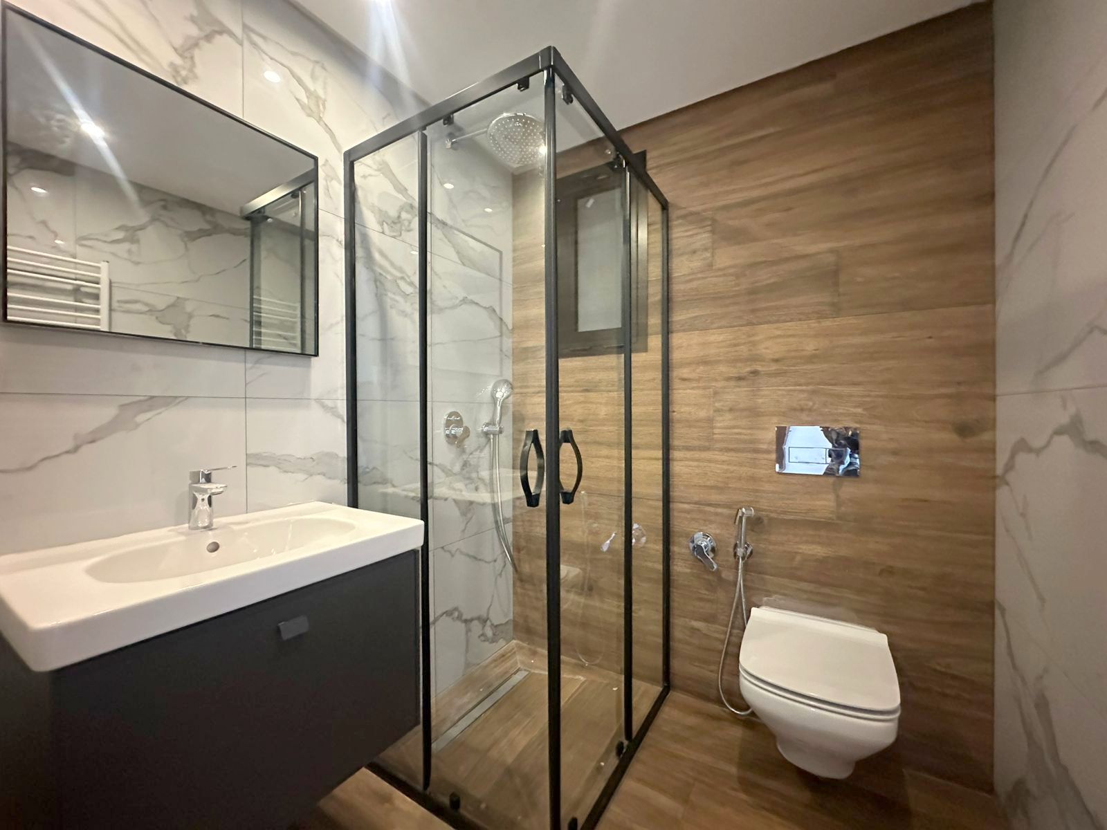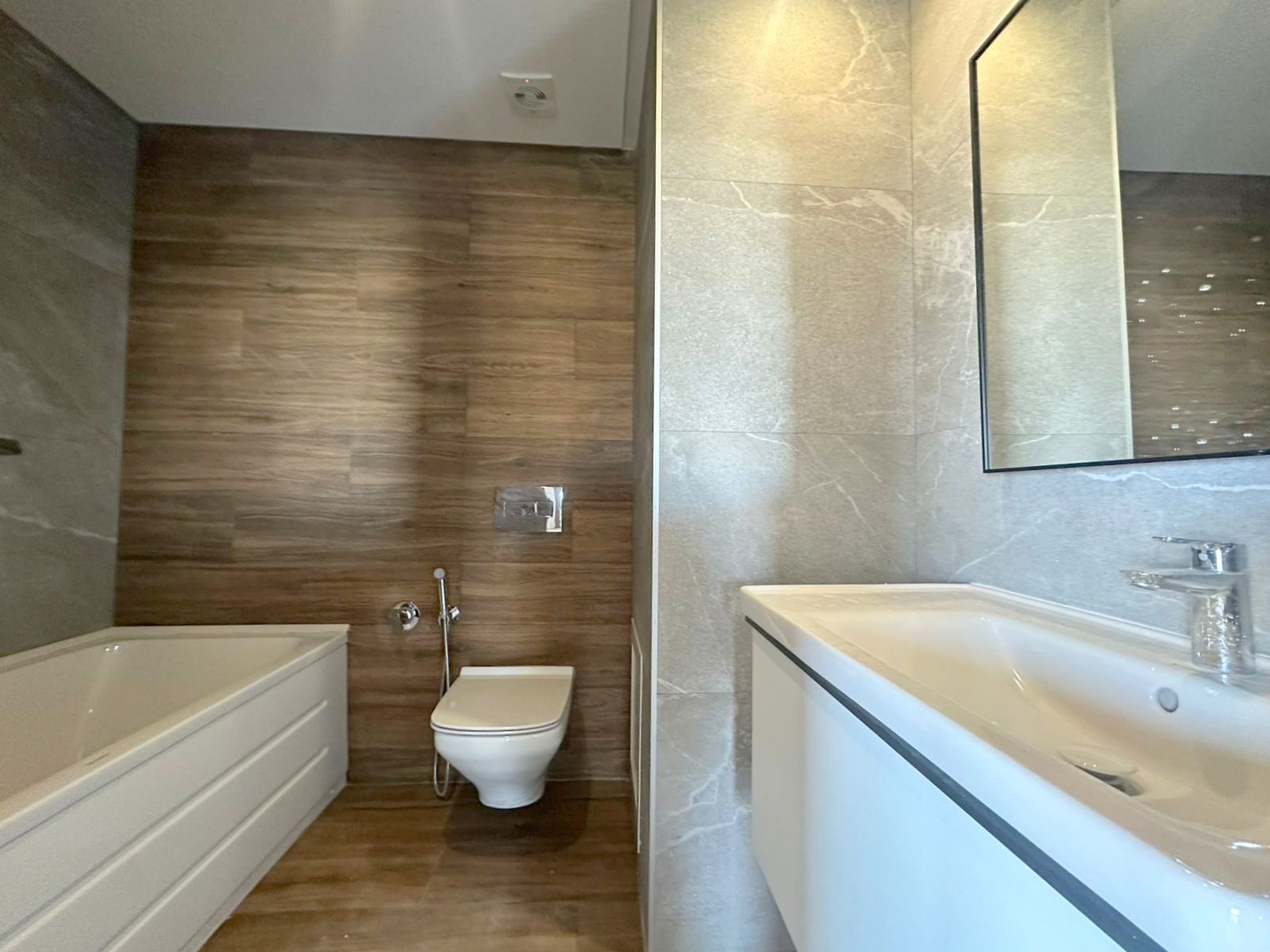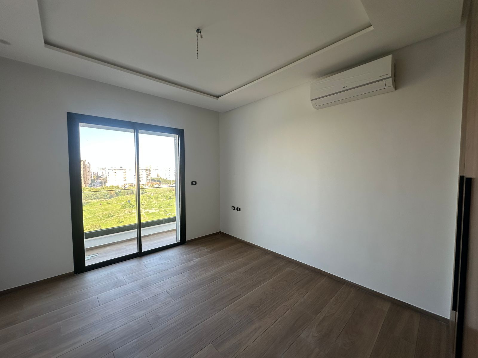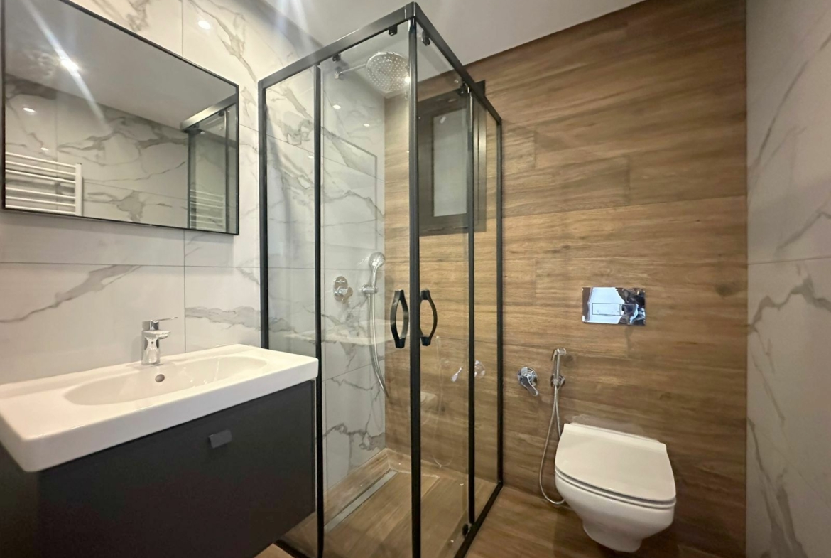 Cet appartement jamais habité est situé au cinquième étage dans une résidence récemment construite, équipée par une salle de sport commune. L’entrée donne sur un salon lumineux donne accès à une terrasse, bénéficiant d’une vue dégagée. La cuisine est aménagée de plusieurs espaces de rangement, équipée d’une plaque de cuisson, un four électrique et une hotte aspirante, complétée par un séchoir exploitable. La partie nuit se compose d’une suite parentale avec sa propre salle de douche, une chambre à coucher avec dressing ainsi qu’une salle de bain. L’appartement est équipé du chauffage central et une climatisation en multi split. Une place de parking est réservée au sous-sol.