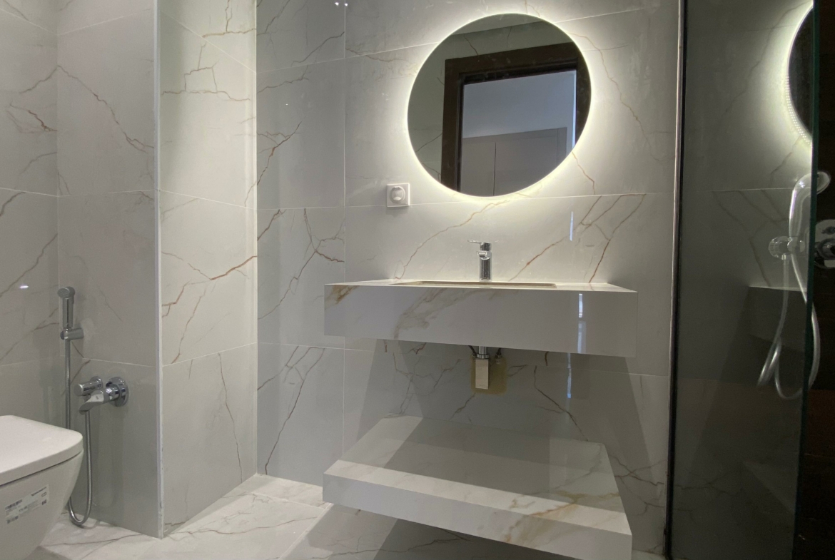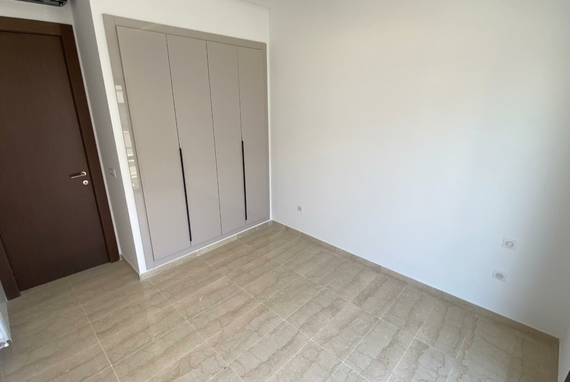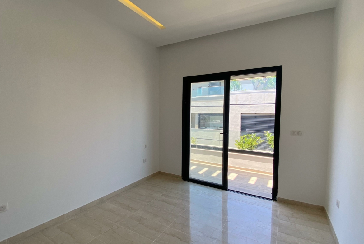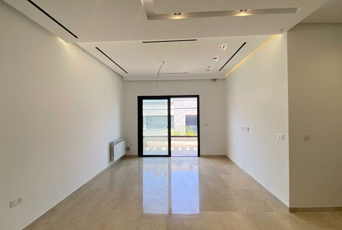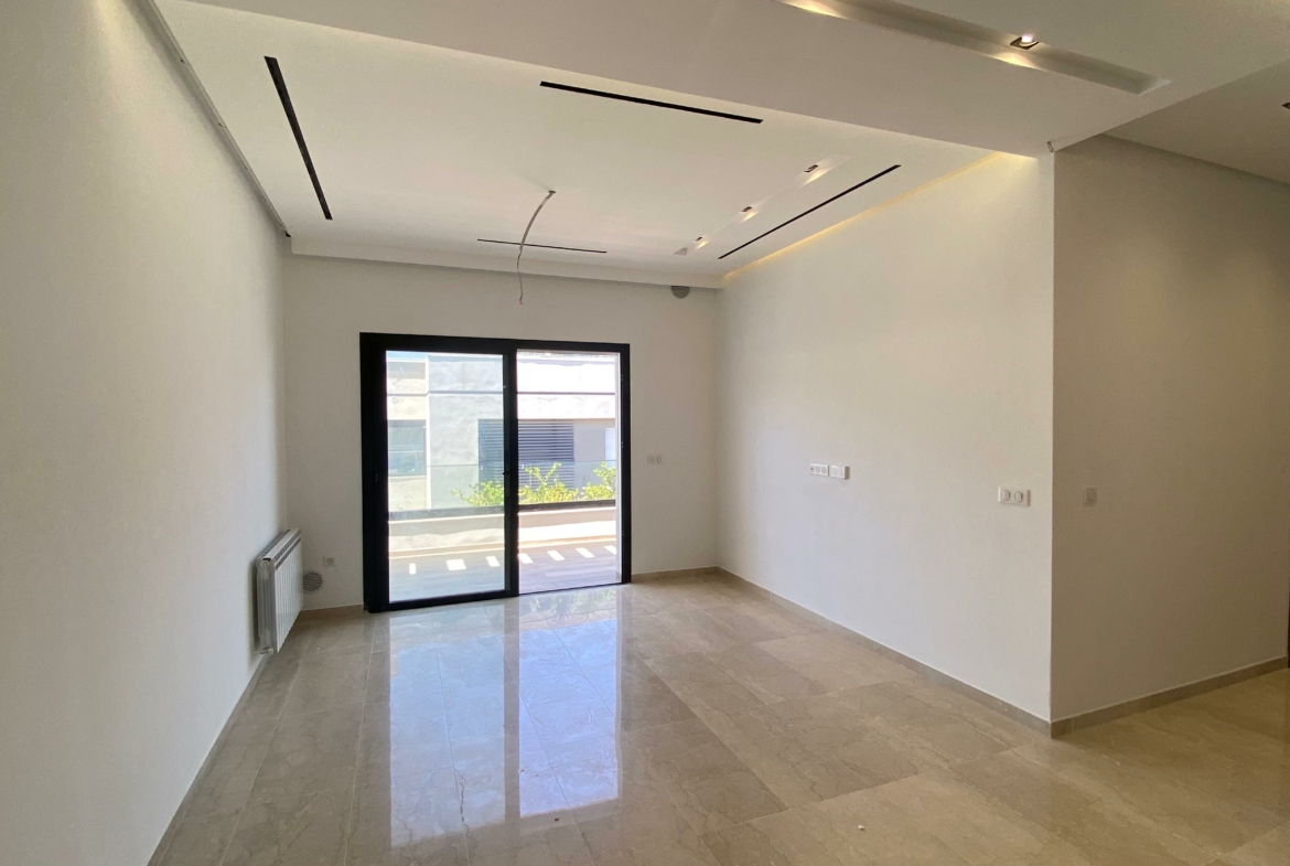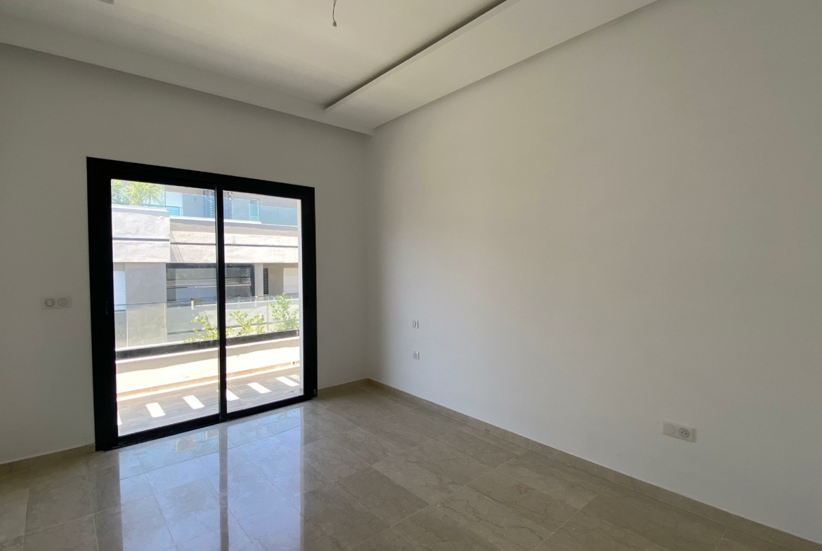 Appartement en S+2 neuf, situé au 3ème étage d’une résidence récemment construite, équipée d’un ascenseur. La partie jour comprend une cuisine américaine équipée, un salon lumineux avec terrasse ainsi qu’une salle de douche commune. La partie nuit se compose d’une suite parentale avec sa propre salle de douche et un dressing, ainsi que d’une chambre à coucher. L’appartement est doté de la climatisation et du chauffage.