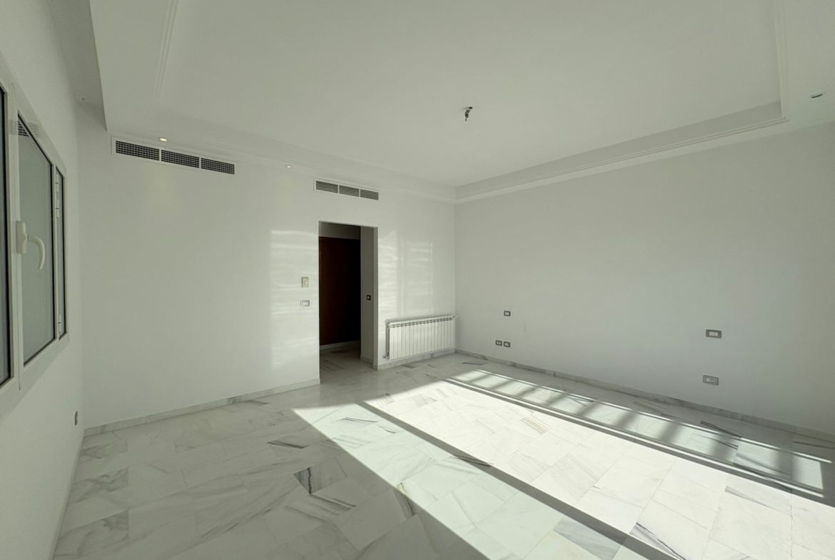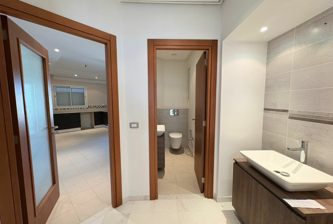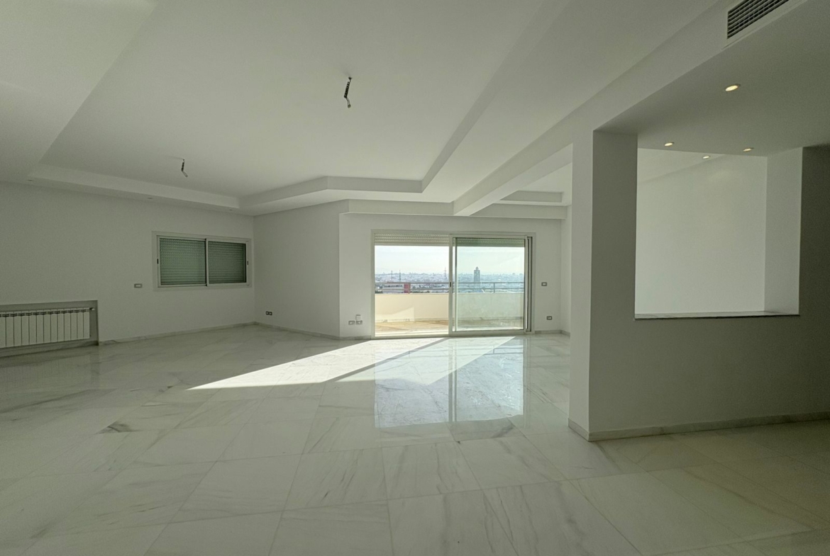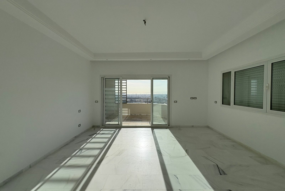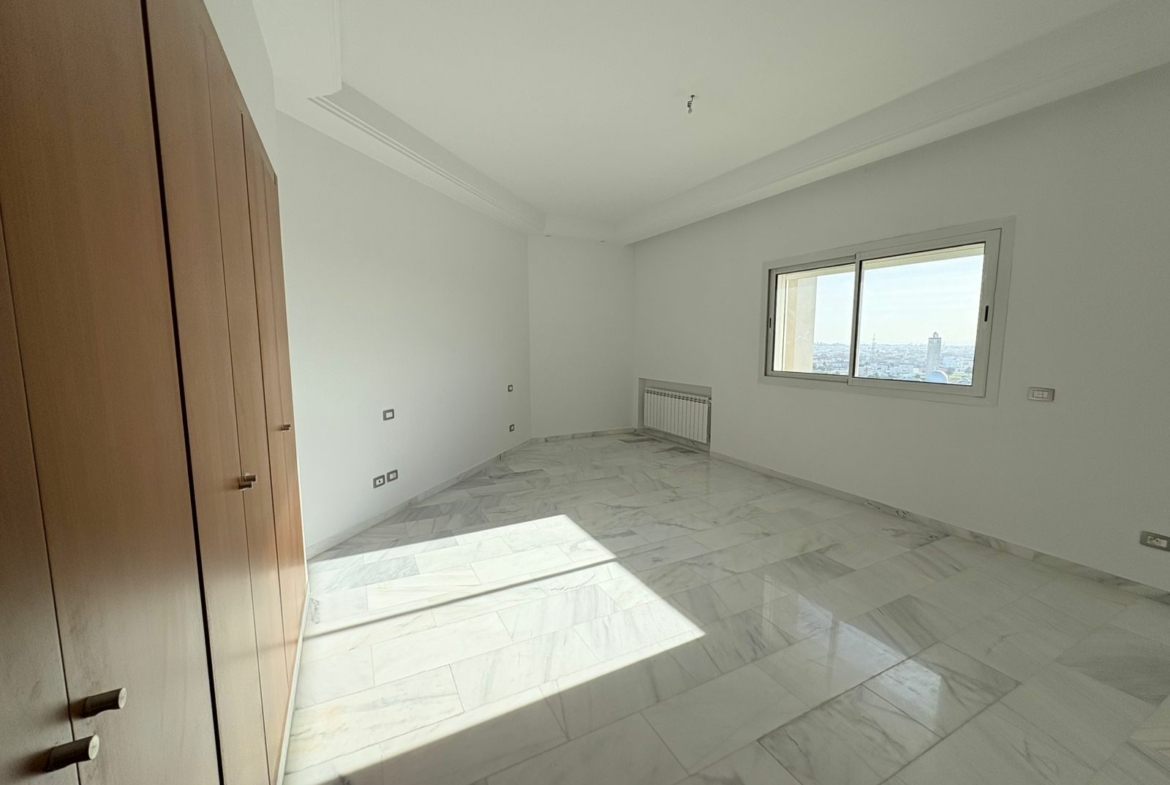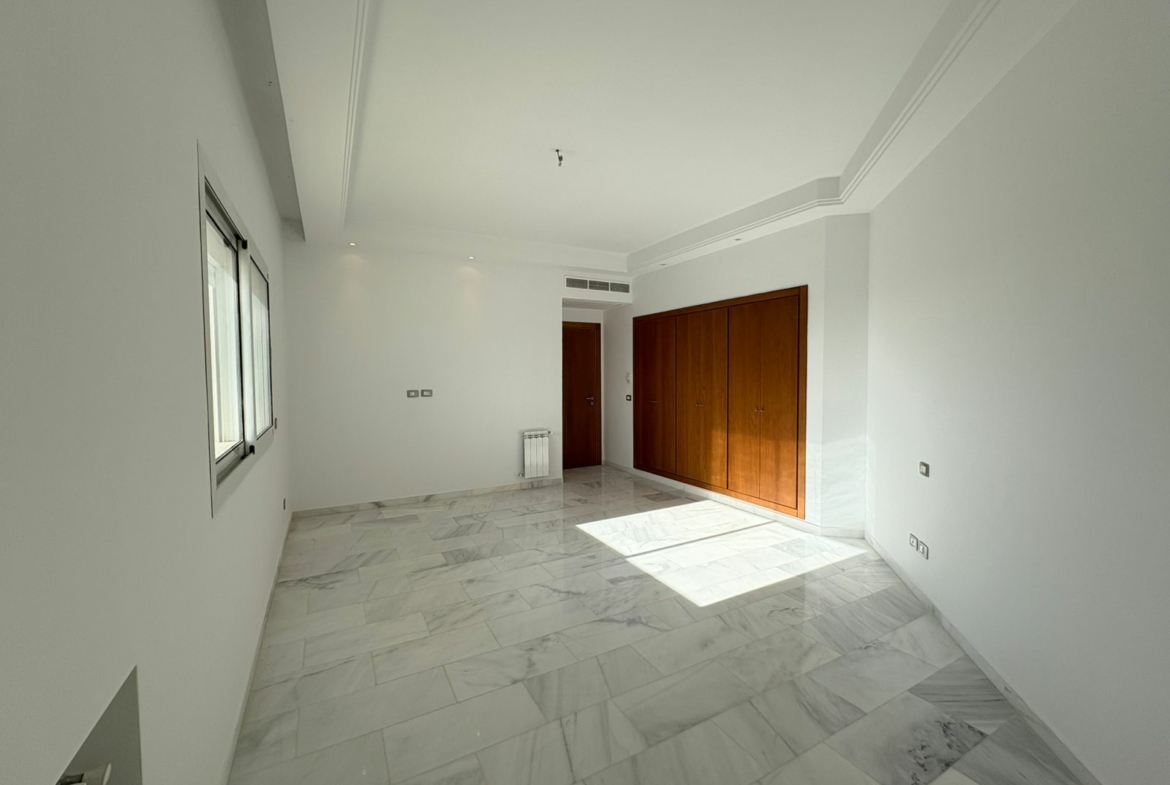 Appartement en S+3 vide, situé au 10ème étage d’une résidence sécurisée avec ascenseur. Il se compose d’un salon spacieux et lumineux avec terrasse, offrant une vue dégagée sur la forêt. La cuisine indépendante et équipée dispose d’un accès à un séchoir et est complétée par une salle d’eau pour les invités. La partie nuit comprend trois suites parentales, dont une avec accès à la terrasse, chacune bénéficiant de sa propre salle de bain et d’un espace dressing. L’appartement est doté de la climatisation et du chauffage.