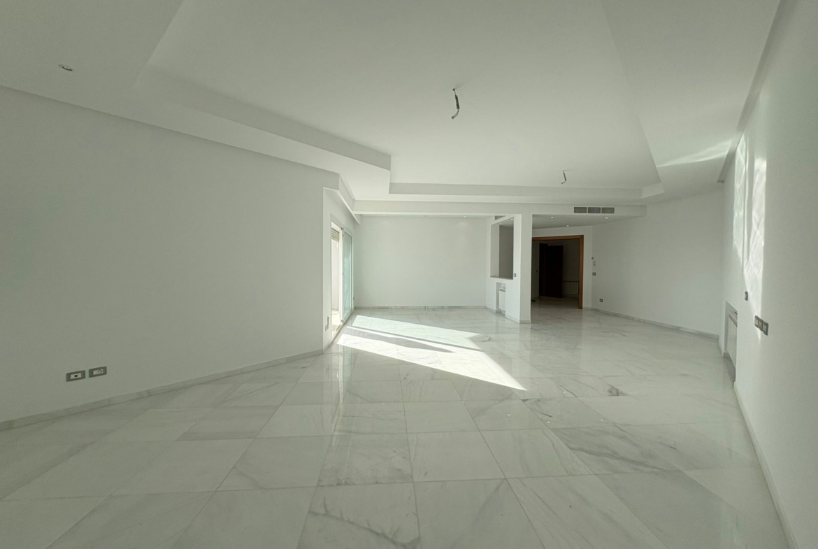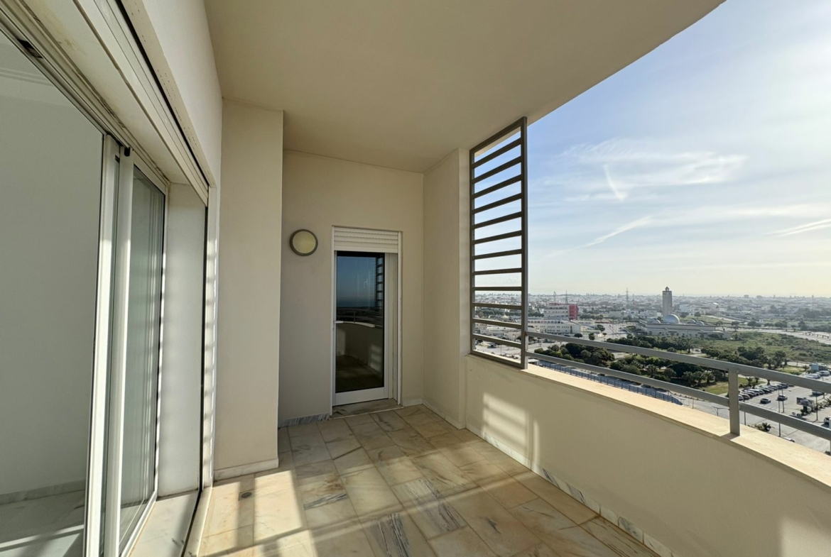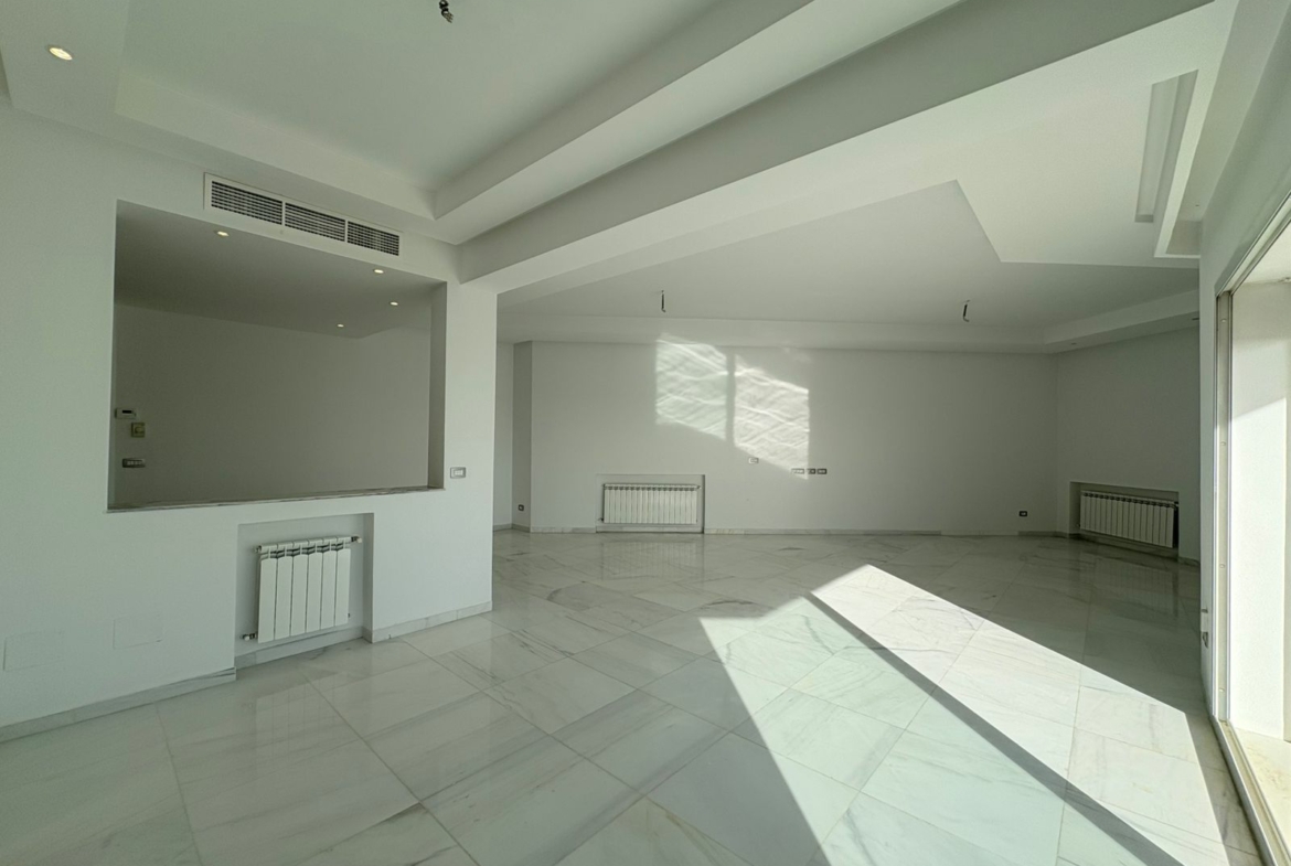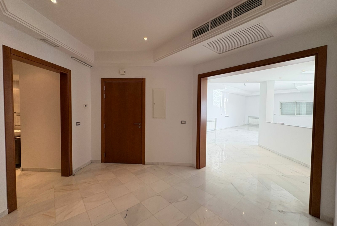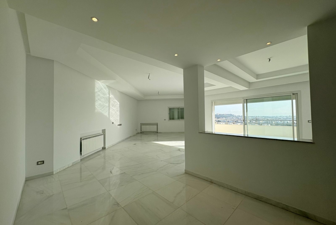 Appartement en S+3 vide, situé au 10ème étage d’une résidence sécurisée avec ascenseur. Il se compose d’un salon spacieux et lumineux avec terrasse, offrant une vue dégagée sur la forêt. La cuisine indépendante et équipée dispose d’un accès à un séchoir et est complétée par une salle d’eau pour les invités. La partie nuit comprend trois suites parentales, dont une avec accès à la terrasse, chacune bénéficiant de sa propre salle de bain et d’un espace dressing. L’appartement est doté de la climatisation et du chauffage.
