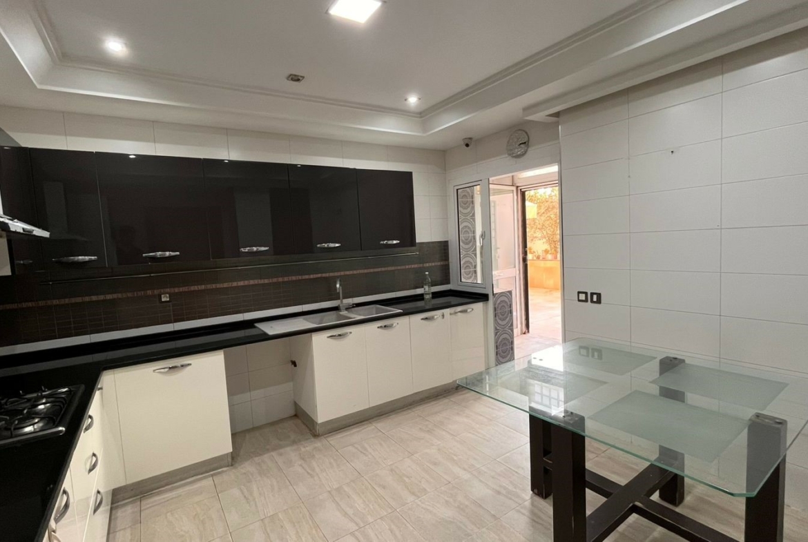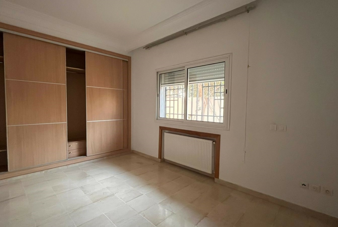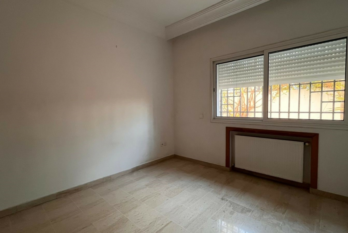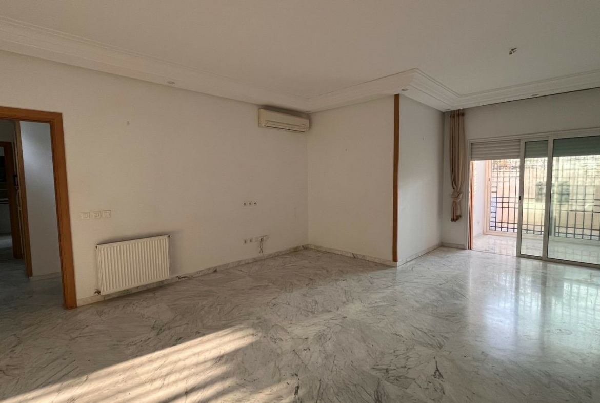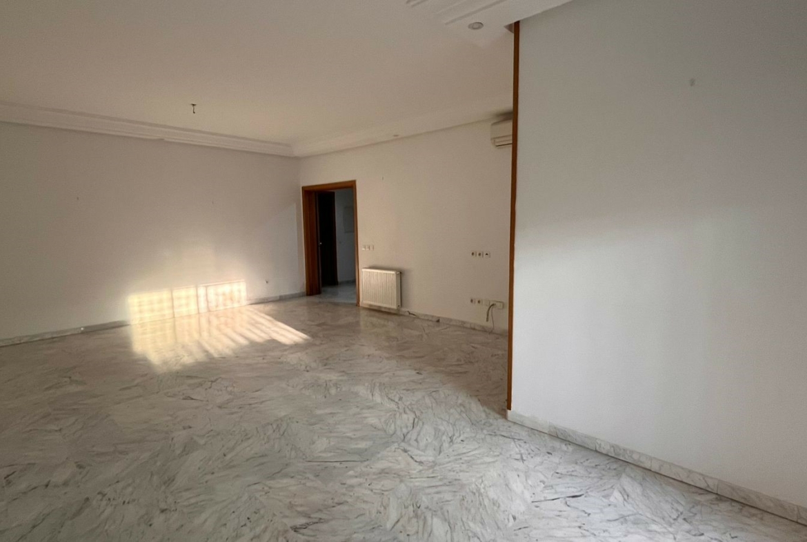 Appartement en S+3 vide d’une superficie de 155 m², situé au rez-de-chaussée d’une résidence sécurisée et bien gardée, dotée d’un ascenseur.