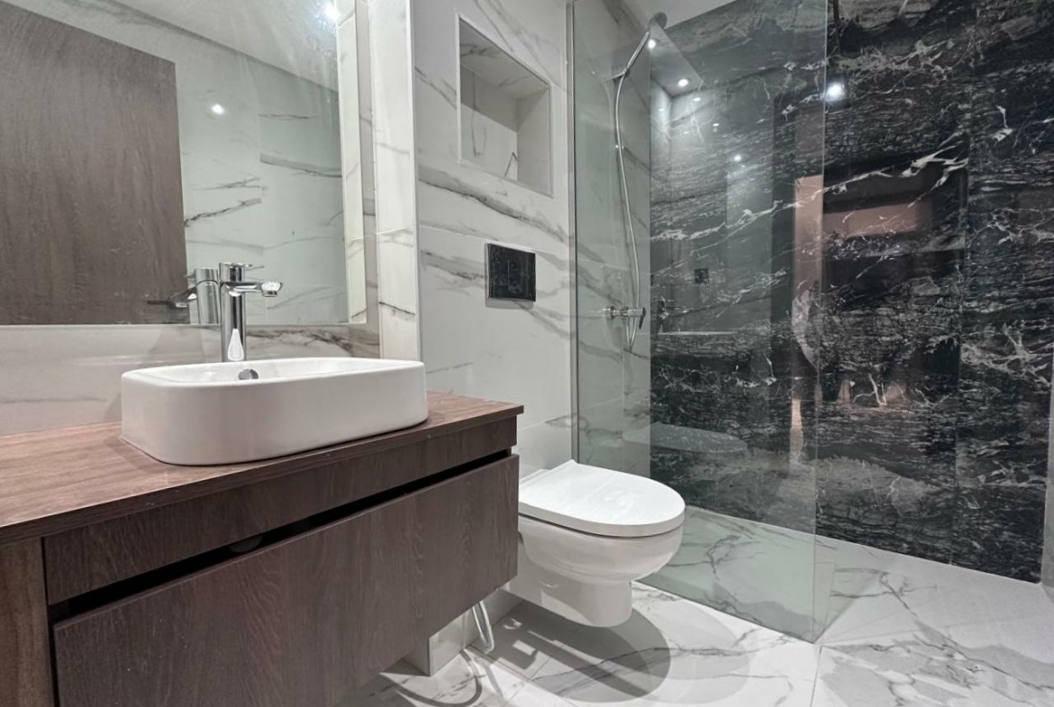 L’entrée s’ouvre sur un salon lumineux donnant accès à un balcon. La cuisine est entièrement aménagée avec des espaces de rangement et équipée d’une plaque de cuisson, d’un four électrique, d’une hotte aspirante et d’un micro-ondes. Elle est complétée par un séchoir. Une salle d’eau pour les invités complète la partie jour.