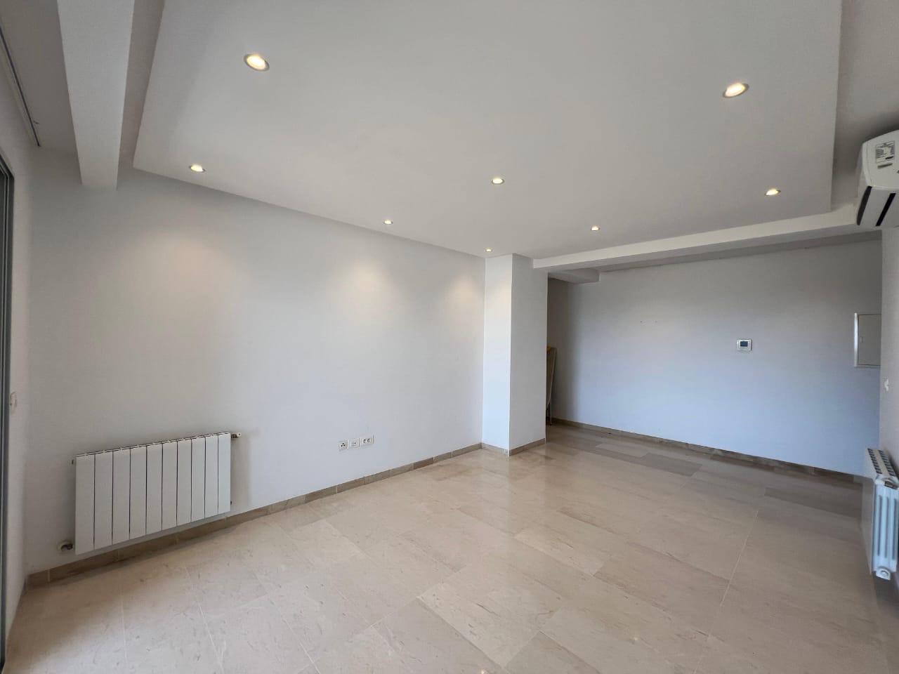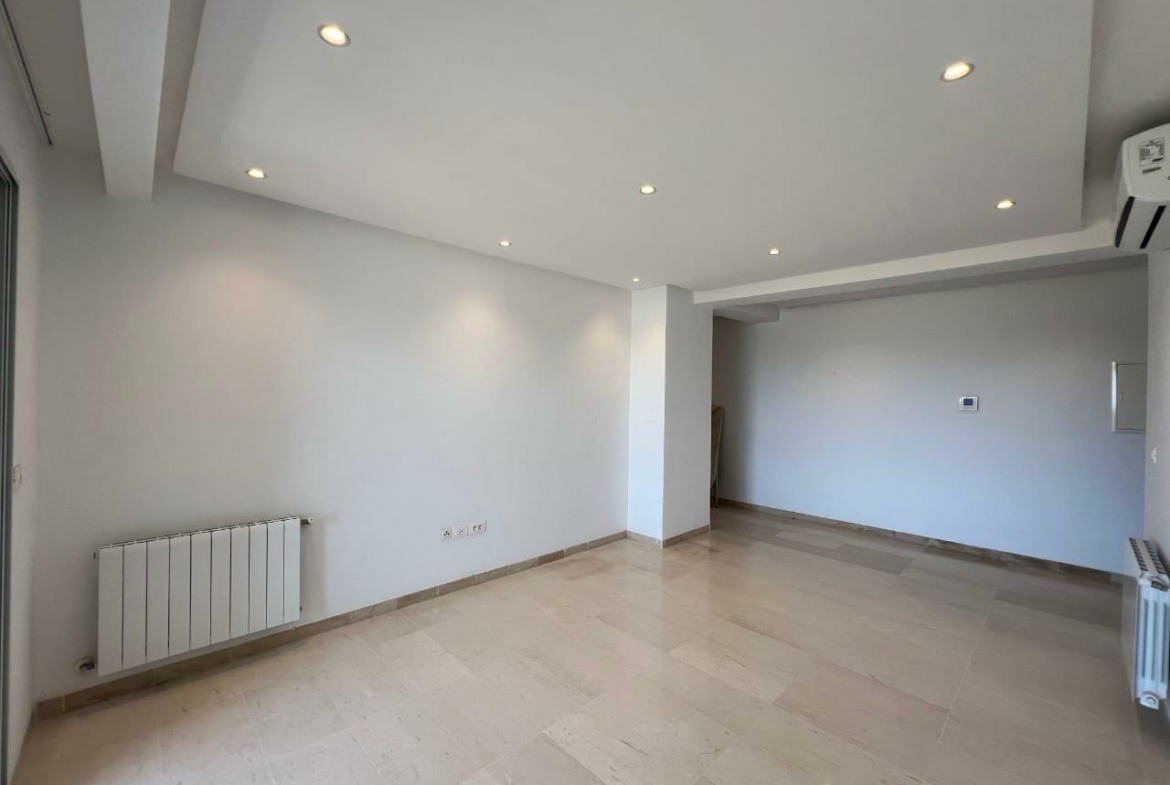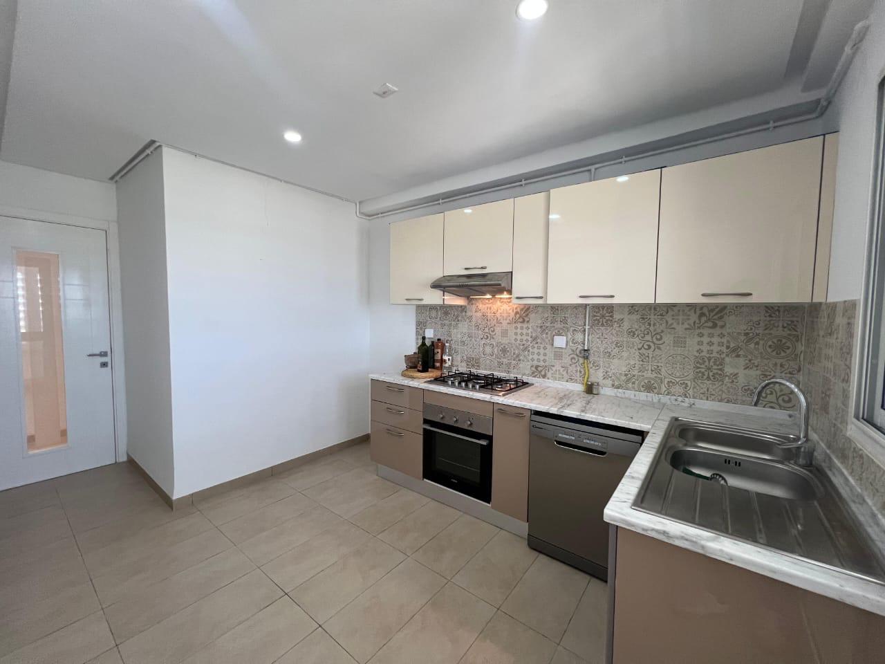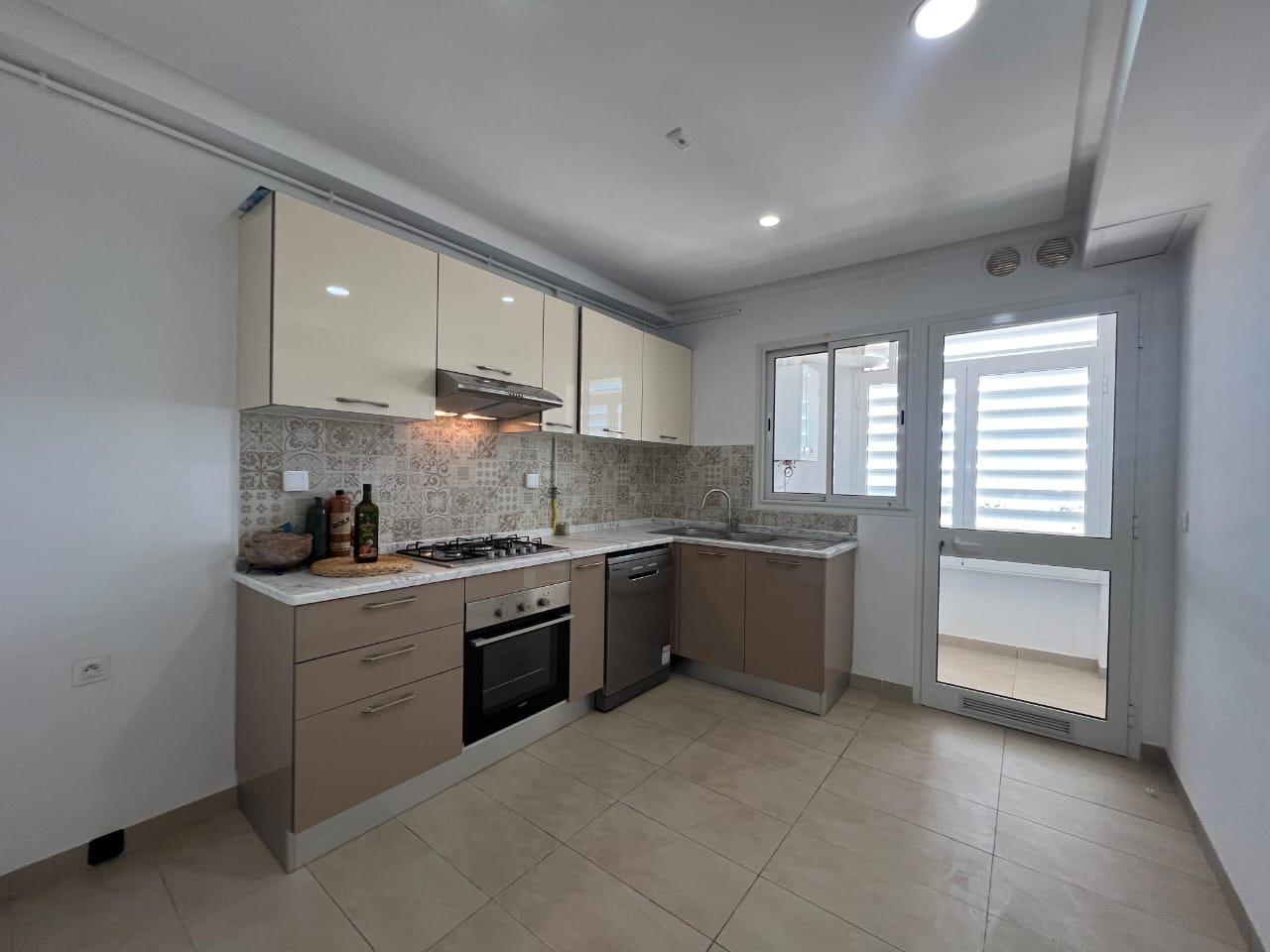 Un salon spacieux et baigné de lumière naturelle grâce à ses ouvertures donnant sur un balcon avec vue dégagée . La cuisine est entièrement équipée d’une plaque de cuisson, d’une hotte aspirante et d’un four électrique, et dispose d’un séchoir attenant. .