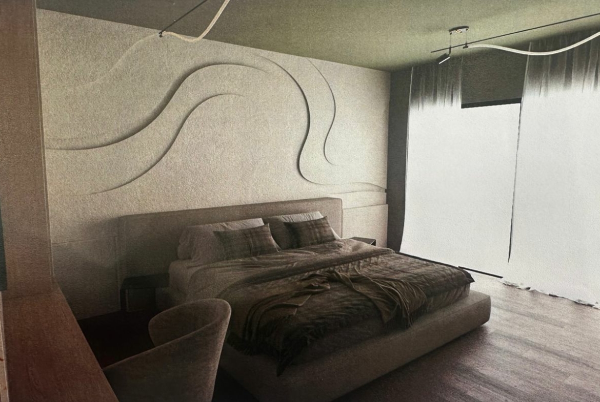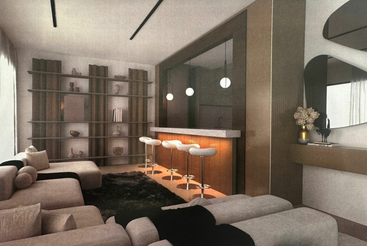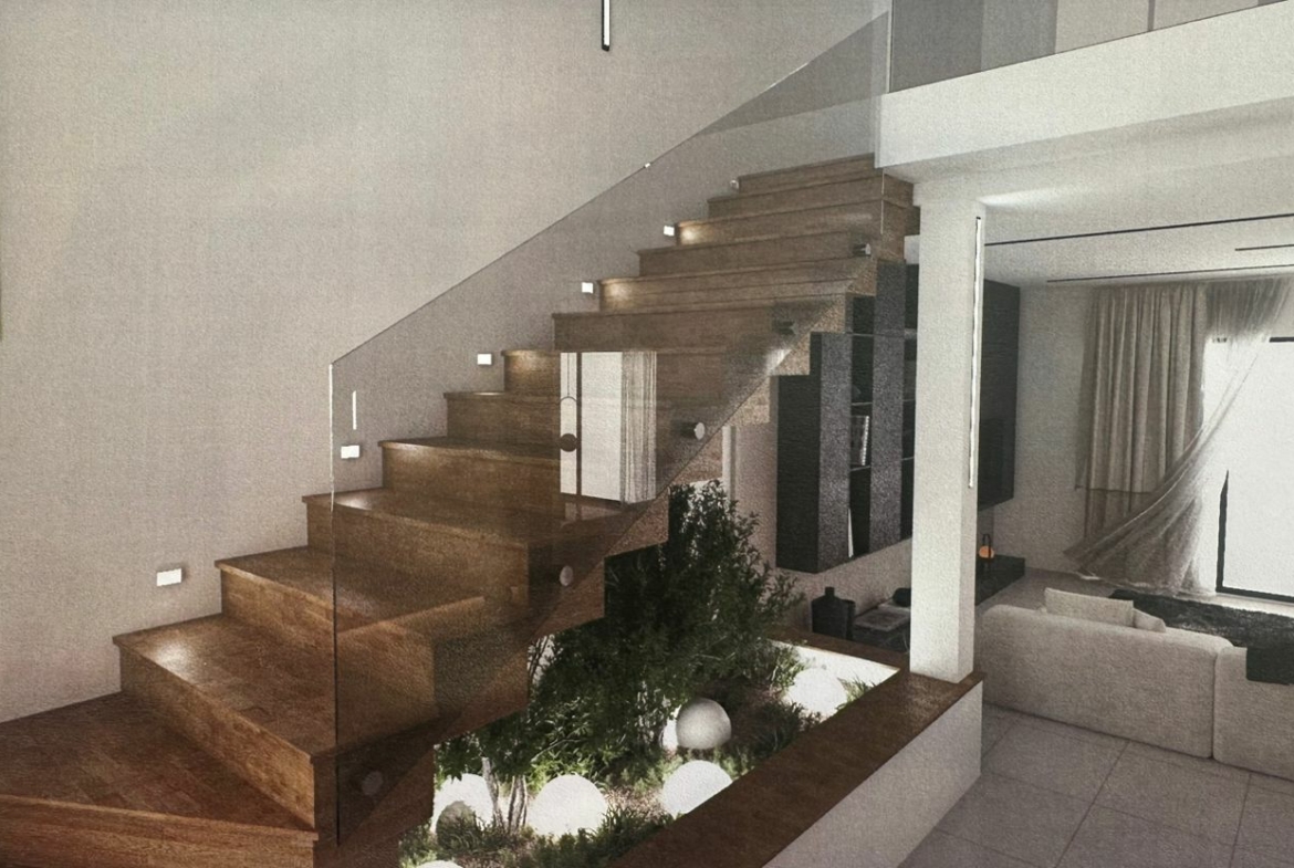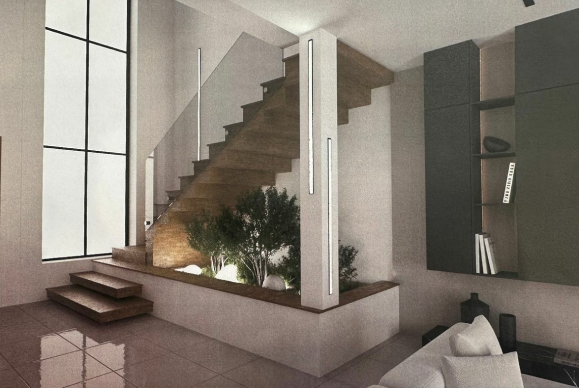 Le rez-de-chaussée s’ouvre sur un hall d’entrée à double hauteur, mettant en valeur un escalier suspendu en bois avec éclairage LED et un garde-corps en verre, apportant une touche résolument contemporaine.